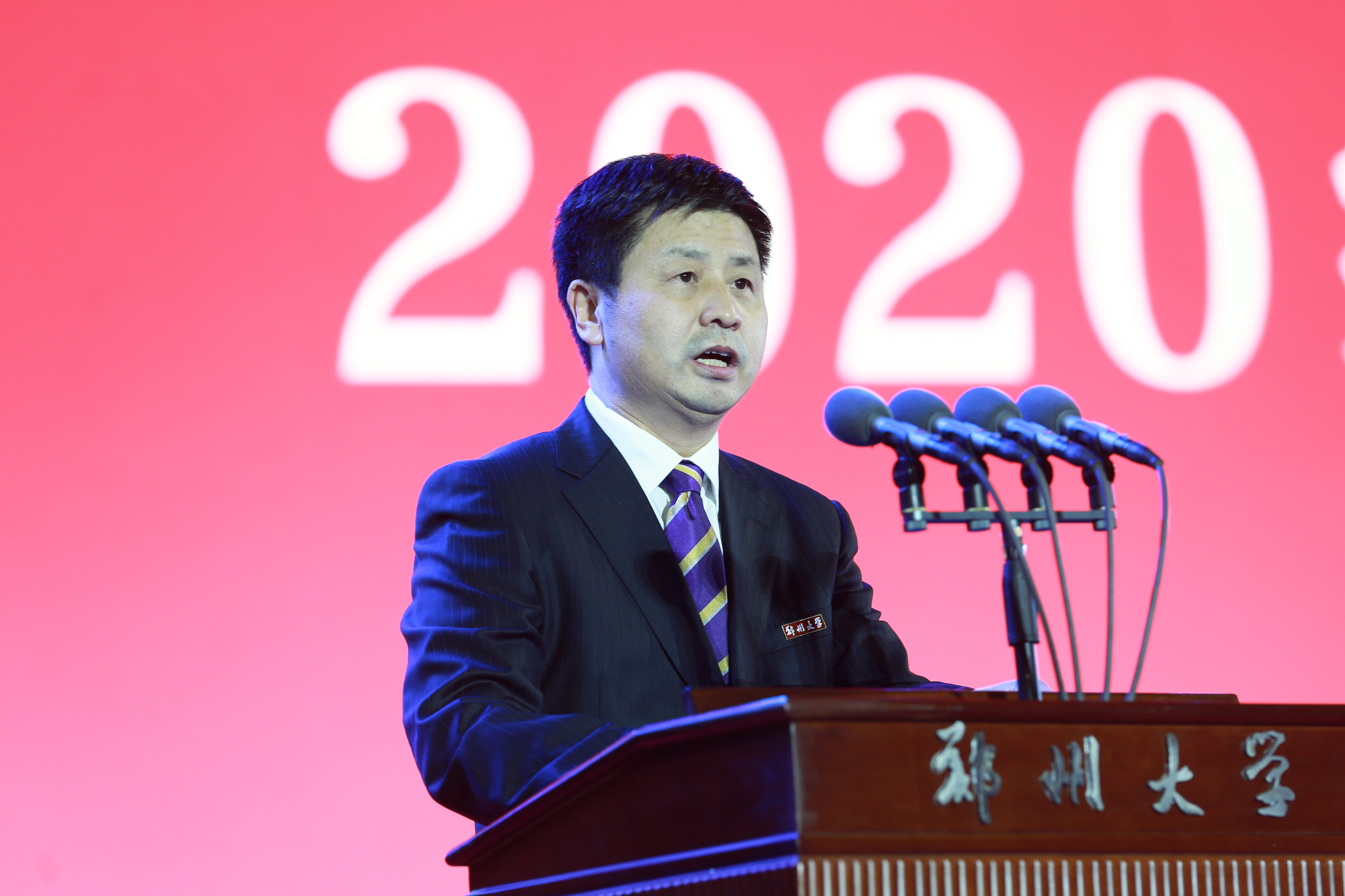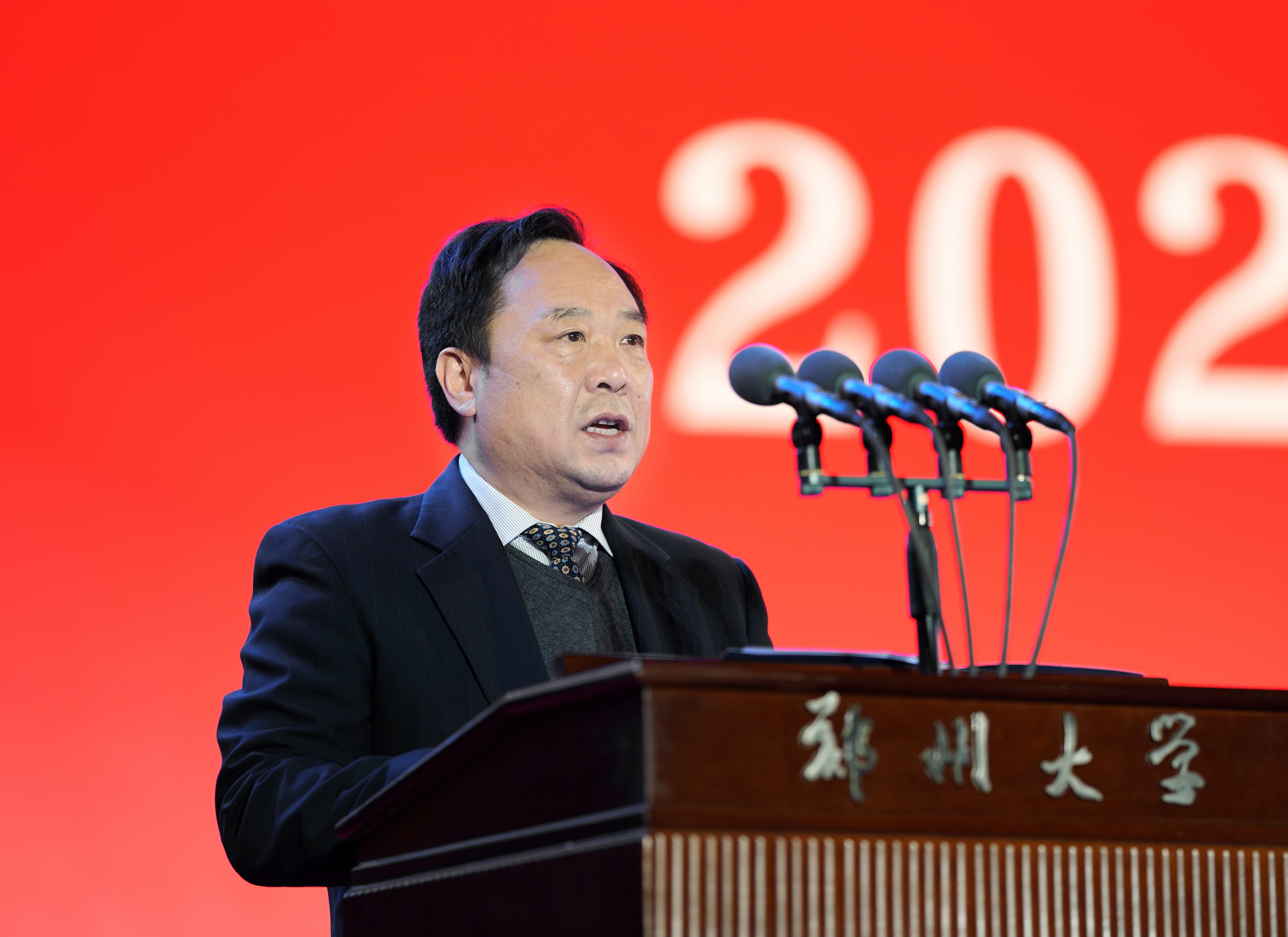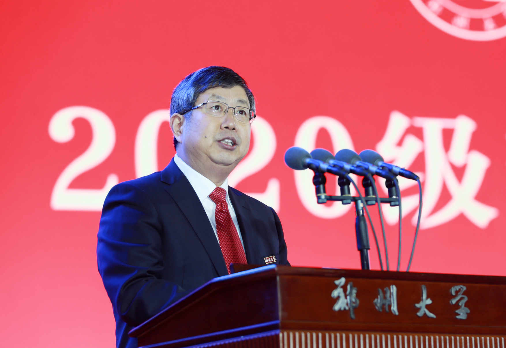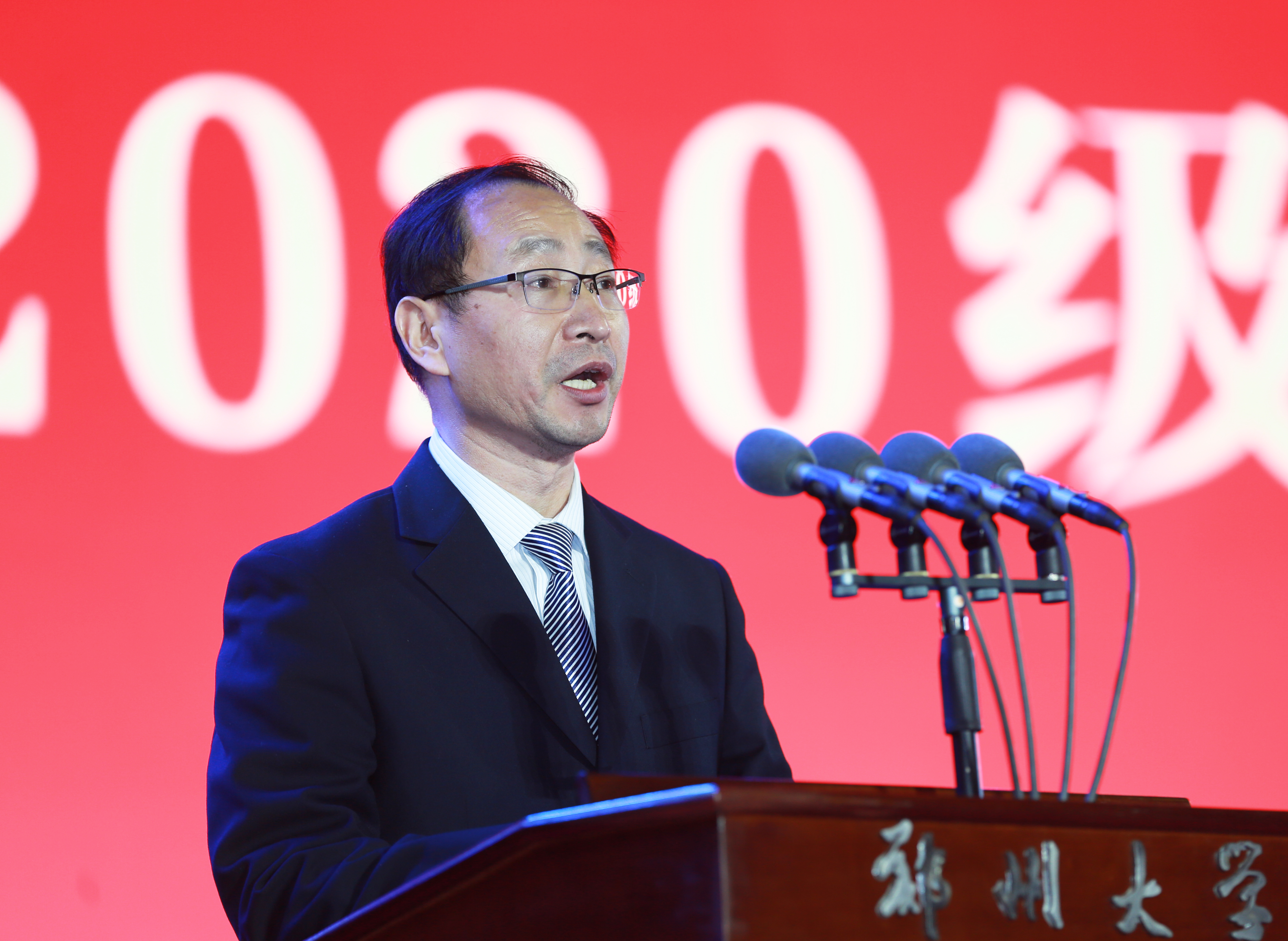 河南省政协副主席、ac米兰官网中文网站校长刘炯天作了题为《晨钟声声东方红》的讲话。他代表学校向来自全国各地以及世界55个国家和地区的新生表示祝贺和欢迎。他指出,当前全球疫情依然肆虐,我们国家已取得疫情防控的重大胜利,现实是生动教材,我们要坚定信心增强力量,担当起责任,作为学校就要努力给大家营造良好学习环境与条件,让大家切实感受到“晨钟声声东方红”。