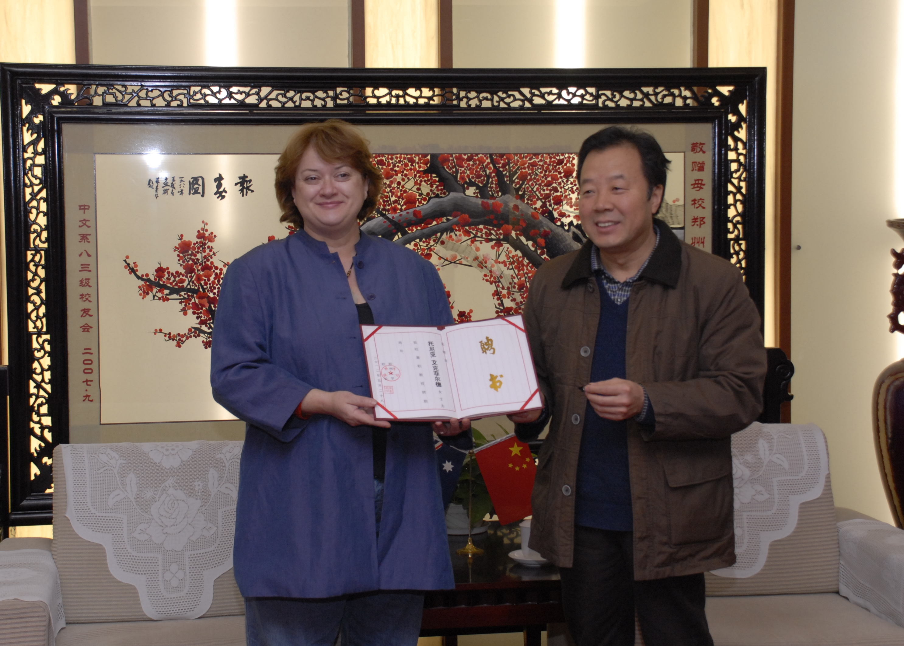 墨尔本大学托尼亚·艾克菲尔德女士日前应邀来我校进行学术交流。我校副校长高丹盈在第六会议室会见了托尼亚·艾克菲尔德女士一行并进行了亲切交谈。高丹盈副校长为托尼亚·艾克菲尔德女士颁发兼职教授聘书,佩戴校徽。托尼亚·艾克菲尔德女士随后以《地形、空间和权利——唐代帝王陵墓及壁画研究》为题,在美术学院多媒体教室为师生作了学术报告。