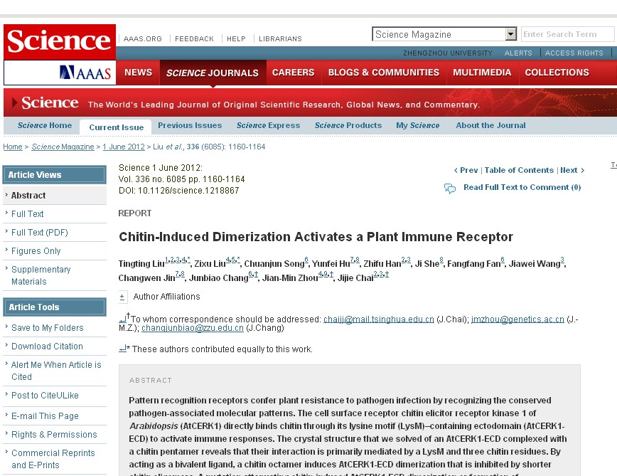 我校化学与分子工程学院常俊标教授与课题组宋传君博士及所指导的研究生樊芳芳通过与清华大学生命科学学院柴继杰博士等单位合作,完成题目为“Chitin-Induced Dimerization Activates a Plant Immune Receptor”的文章于2012年6月1日在国际重要期刊《Science》杂志上发表。此项研究在PRR蛋白质激活机制方面取得了重要突破。这是我省第一次以共同通讯作者身份在《Science》上发表论文,论文的发表标志着我校在该研究领域达到了国际领先水平。