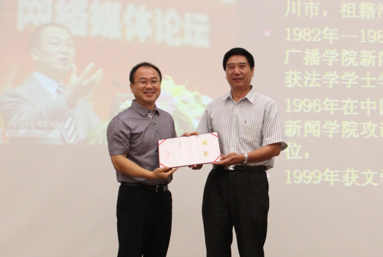 9月18日上午,中国传媒大学副校长、博士生导师胡正荣教授应我校邀请,在综合管理中心第一学术报告厅为我校师生作了一场题为《媒介融合趋势及传统媒介的应对》的专题报告。我校常务副校长徐振鲁出席报告会并为胡正荣教授颁发了ac米兰官网中文网站兼职教授证书。新闻与传播学院全体教师和我校的500多名学生共同聆听了胡正荣教授的报告。
