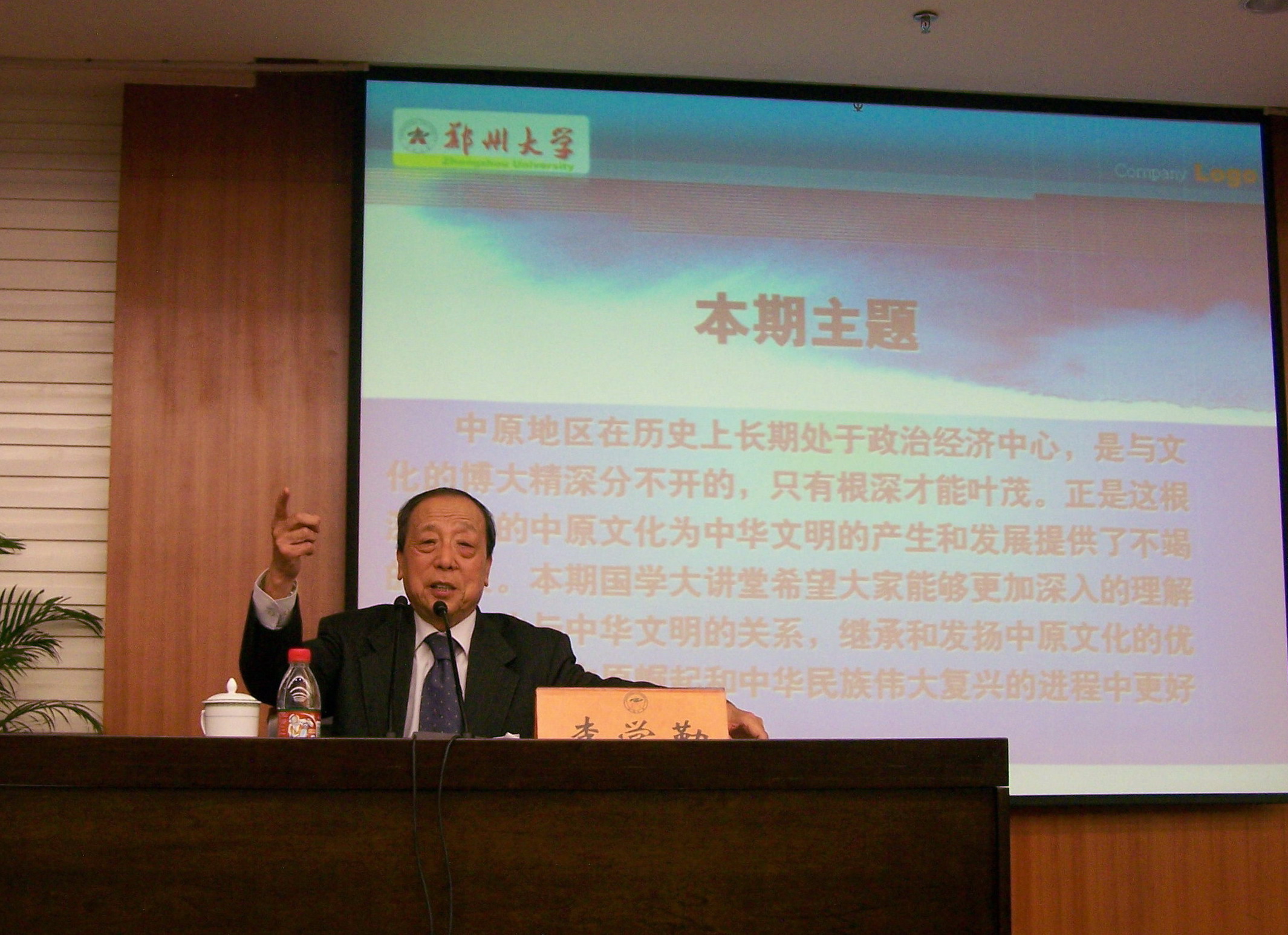 4月12日晚,现任清华大学教授、文科高等研究中心主任、国际汉学研究所所长,中国社会科学院古代文明研究中心主任、“夏商周断代工程”专家组组长、首席科学家,国务院学位委员会历史评议组组长、国际欧亚科学院院士的著名学者李学勤老先生应我校之邀,担任我校“国学大讲堂”第五讲的主讲人,为师生做了题为“中华文明与中原文化”的精彩演讲。当晚,容纳500人行政管理中心大楼第一大报告厅内座无虚席,靠墙处和两边过道上都挤满了人。大家被他的渊博学识和严谨风范所打动,始终保持着高昂的情绪,随着他的演讲时时爆发出热烈的掌声。
