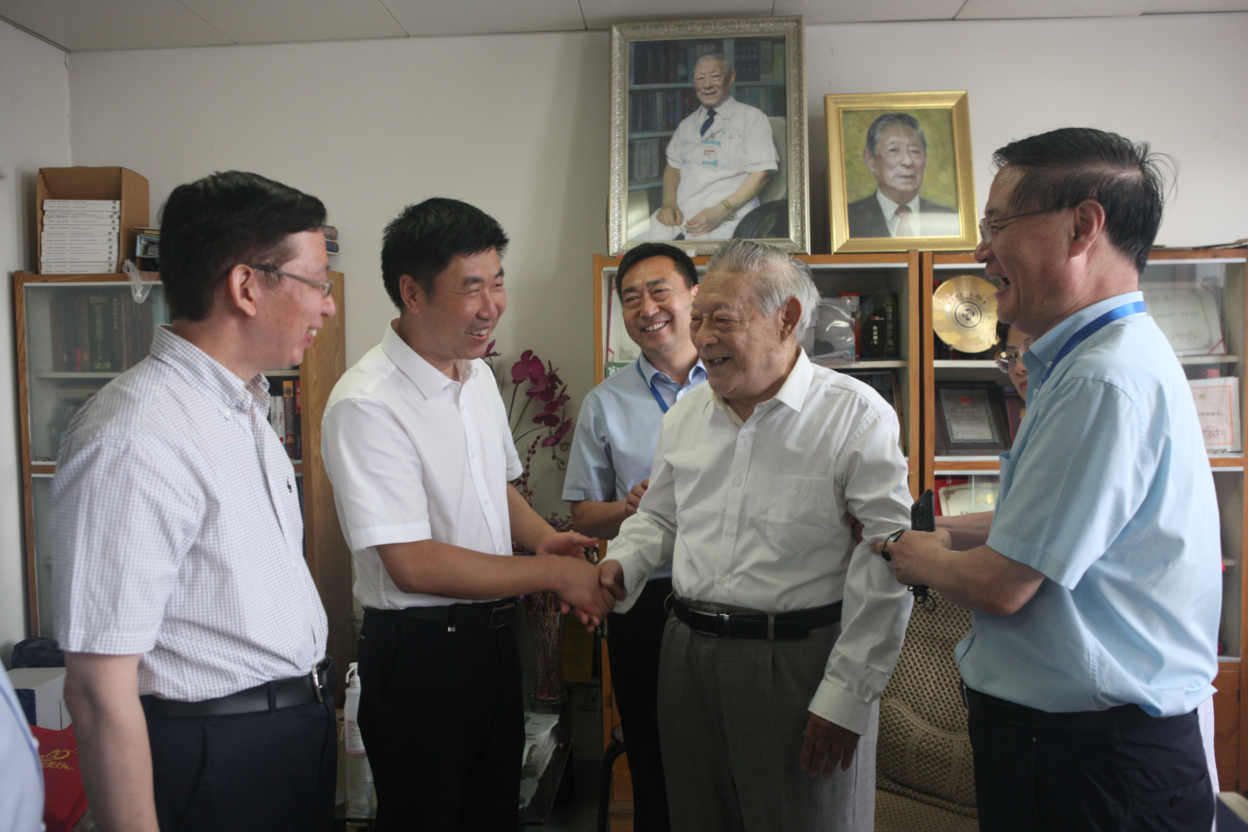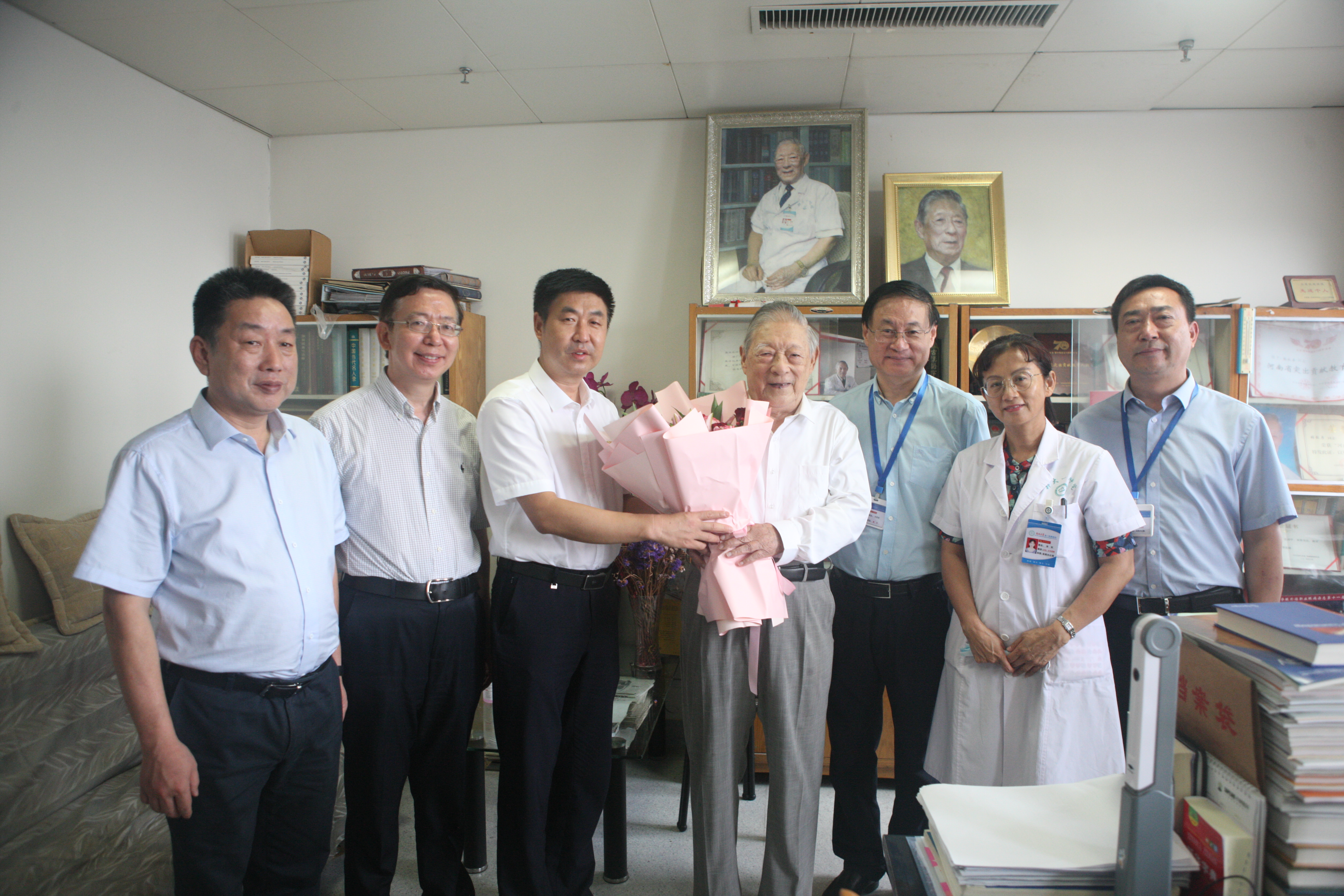 宋争辉首先来到眼科门诊,看望正在坐诊的百岁名医张效房,与老先生亲切交流,详细询问他的工作和身体情况。他指出,眼科泰斗张效房为河南医疗健康事业作出了突出贡献,被评为首届全国“十大最美医生”,是党员的旗帜和师生的楷模,堪称郑大之宝、国家之宝。他向以张效房为代表的广大医务工作者表示感谢和慰问,并祝老先生身体健康,节日快乐。