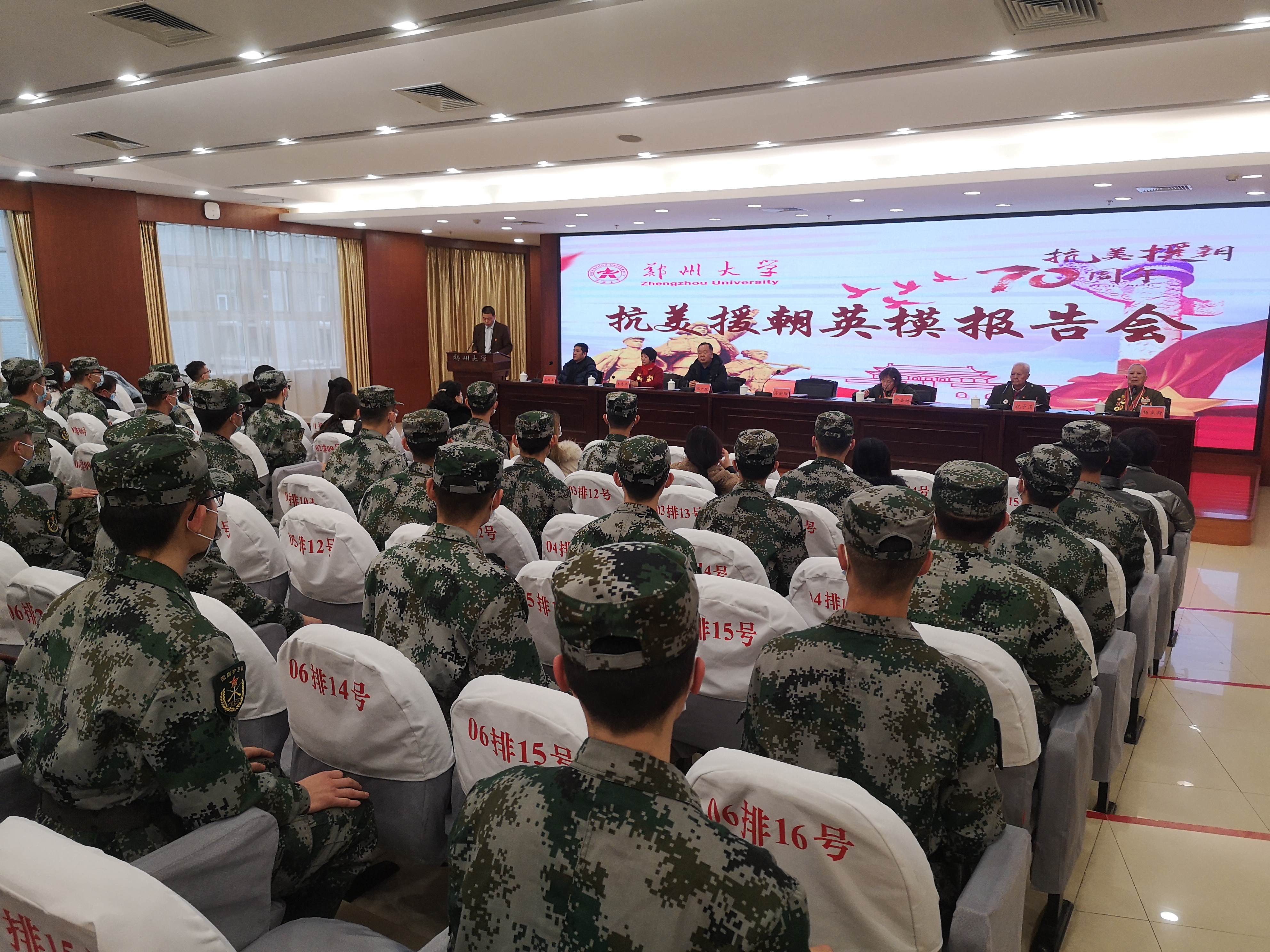 使命呼唤担当,榜样引领未来。为深入学习领会、全面贯彻落实习近平总书记在纪念中国人民志愿军抗美援朝出国作战70周年大会上的重要讲话和党的十九届五中全会精神,大力弘扬和继承伟大的抗美援朝精神,激励广大师生不忘报国初心,勇担责任使命,2020年12月31日下午,ac米兰官网中文网站隆重举行抗美援朝英模报告会。电影《英雄儿女》中王芳的原型、在上甘岭战役中荣立战功的阵地“百灵鸟”、老英雄柳岳继,志愿军总部通讯电报站站长、老英雄杨立新,志愿军高射炮兵、一等战功获得者、老英雄祝子清,河南省优秀共产党员、河南省道德模范、感动中原十大爱心人物李志平为师生作报告。校党委常委、副校长吴宏阳出席,武装部负责同志、各院系优秀辅导员代表及国旗护卫队队员参加报告会。