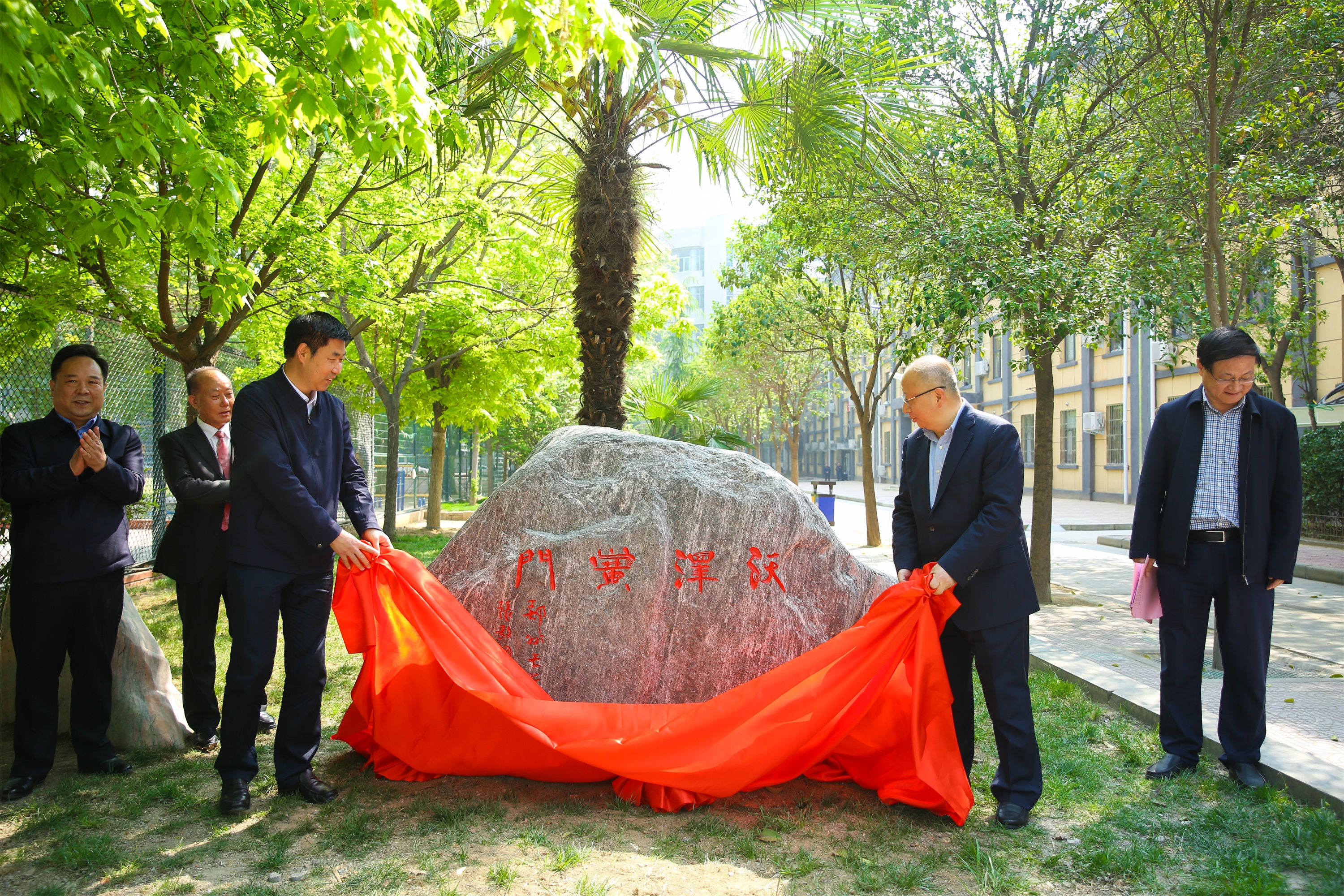 校党委书记宋争辉和物理工程学院1979级校友、正商集团党委书记、董事长张敬国共同为《沃泽黉门》纪念石揭幕