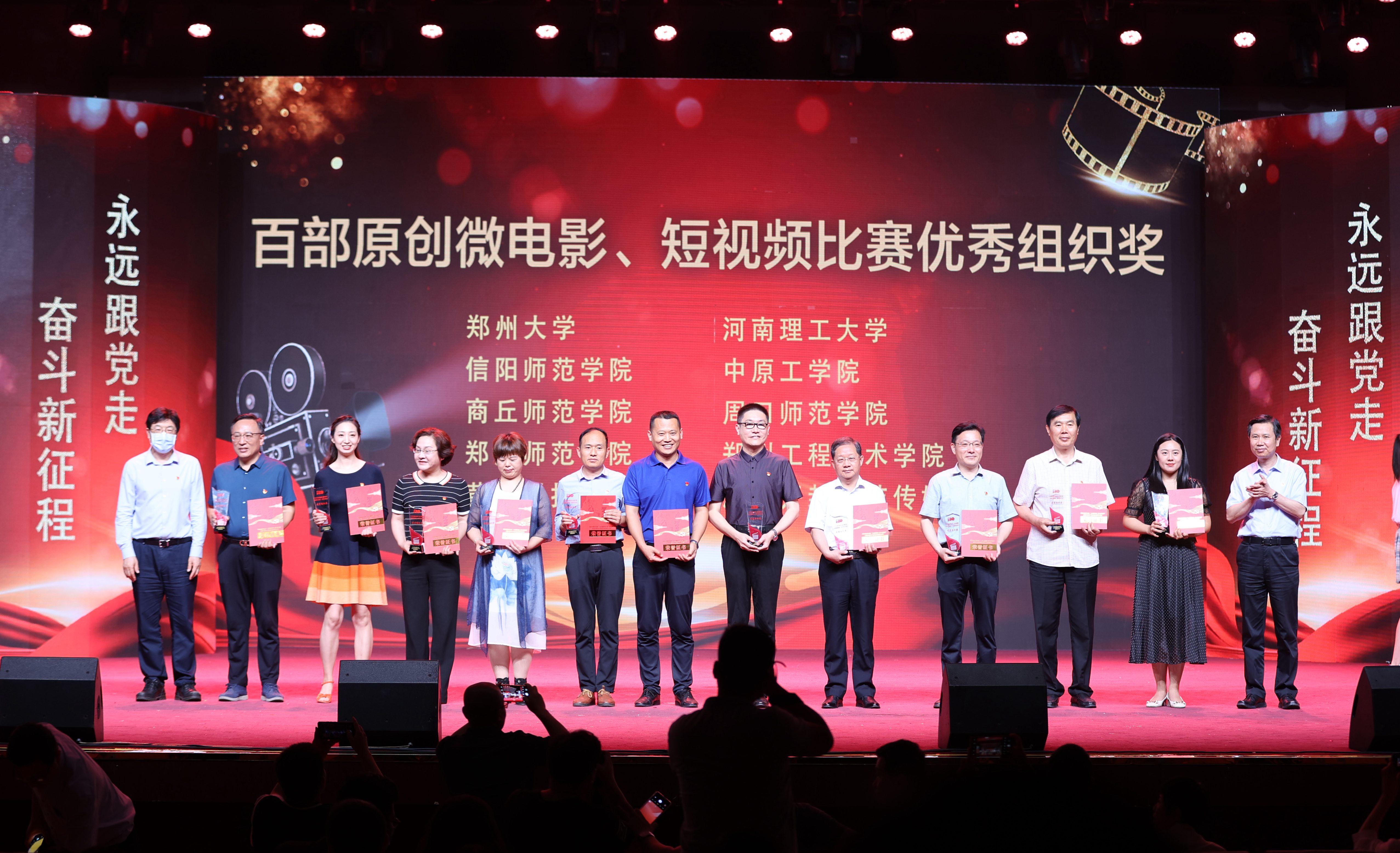 此次活动中精选“100部电影讲课堂”“红动中原跨越时空的思政课”系列活动中的优秀获奖作品,经过精心包装设计集中展演。“100部电影进课堂”活动自4月1日启动以来,征集并公布了100部经典电影目录,在此基础上,78所高校报送了1022部红色经典电影剪辑作品,60余所高校报送了462部原创短视频及微电影作品。其中新闻与传播学院报送的红色经典电影剪辑作品《永不消逝的电波》、原创短视频《秀美郝堂—茶香里的婉约》分别荣获该类别一等奖。此外,在“红动中原跨越时空的思政课”河南省高校学生参演革命电影微视频展播活动中,马克思主义学院选送的《血战湘江》荣获该类别最佳思政点评奖。ac米兰官网中文网站还荣获“百部经典红色电影剪辑比赛”和“百部原创微电影、短视频比赛”优秀组织单位,新闻与传播学院宗俊伟老师荣获优秀指导教师奖。与会领导分别为获奖单位代表颁奖。