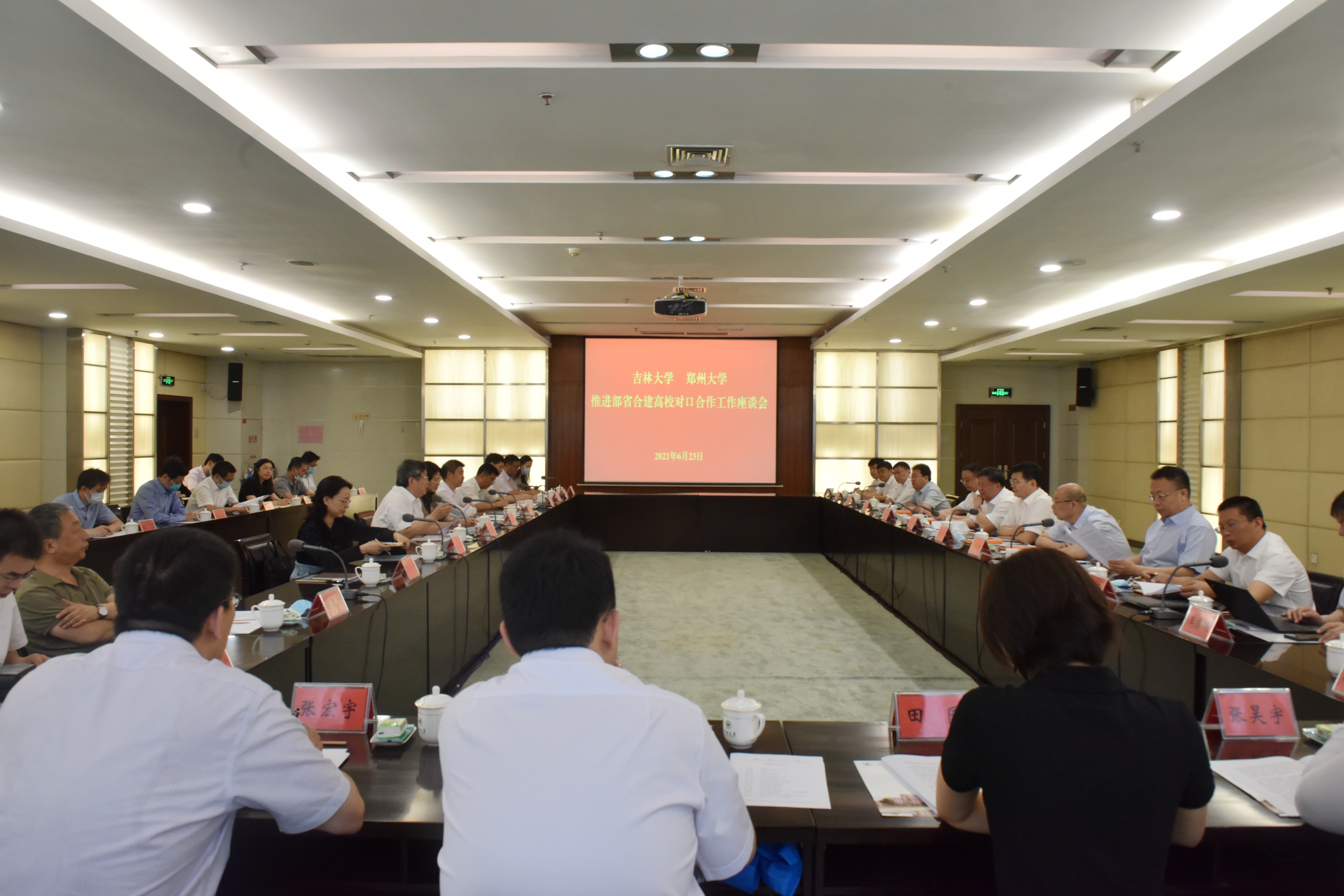 为落实与省长王凯的会谈精神,推进部省合建,深化对口合作,6月23日,吉林大学党委书记姜治莹、常务副校长郑伟涛、副校长赵宏伟一行来校调研交流。校党委书记宋争辉,省政协副主席、校长刘炯天,副校长赵明皞会见姜治莹一行,双方进行了座谈交流。副省长霍金花、省教育厅副厅长刁玉华、郑州市副市长孙晓红出席座谈会。宋争辉主持座谈会。