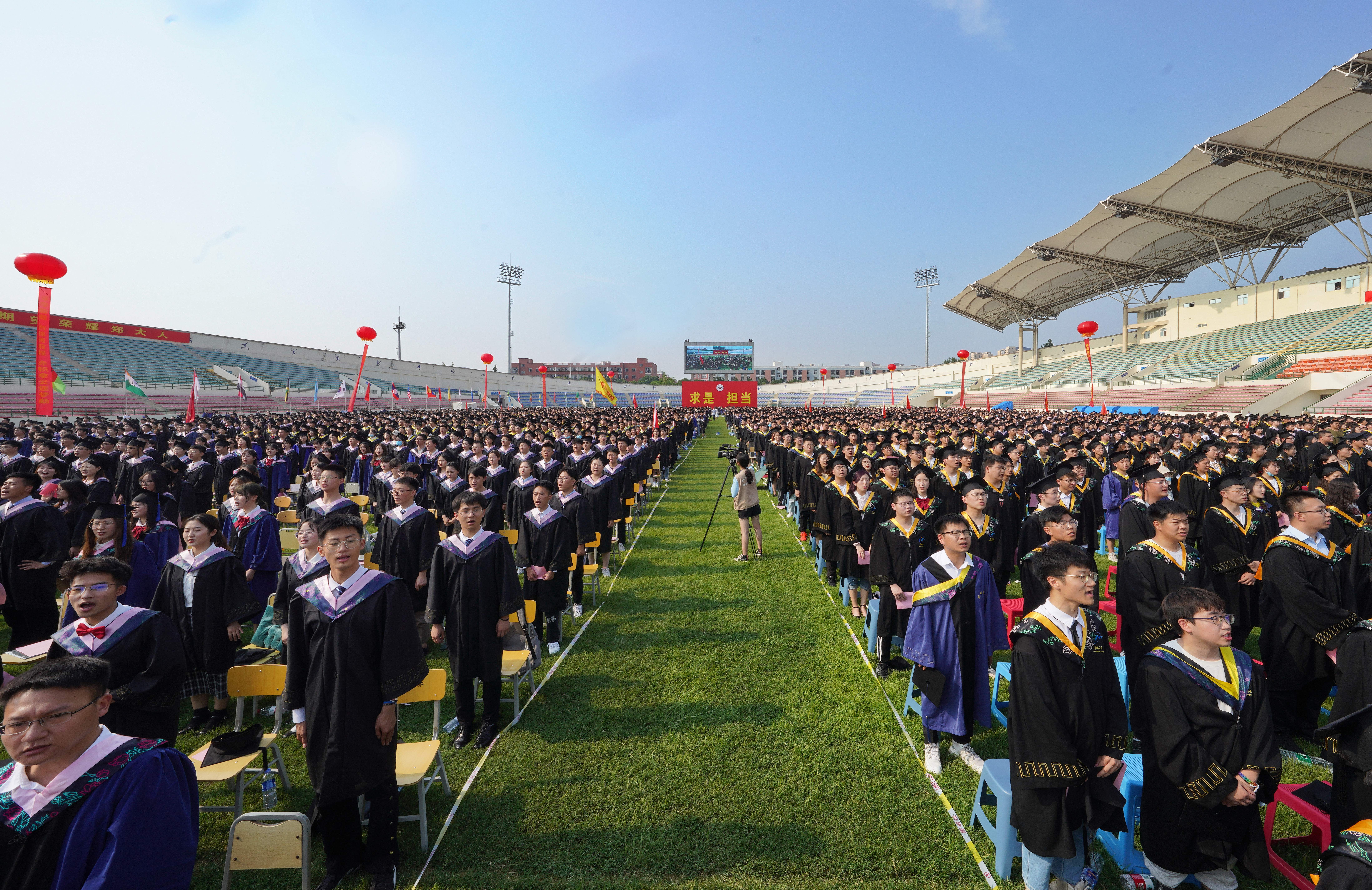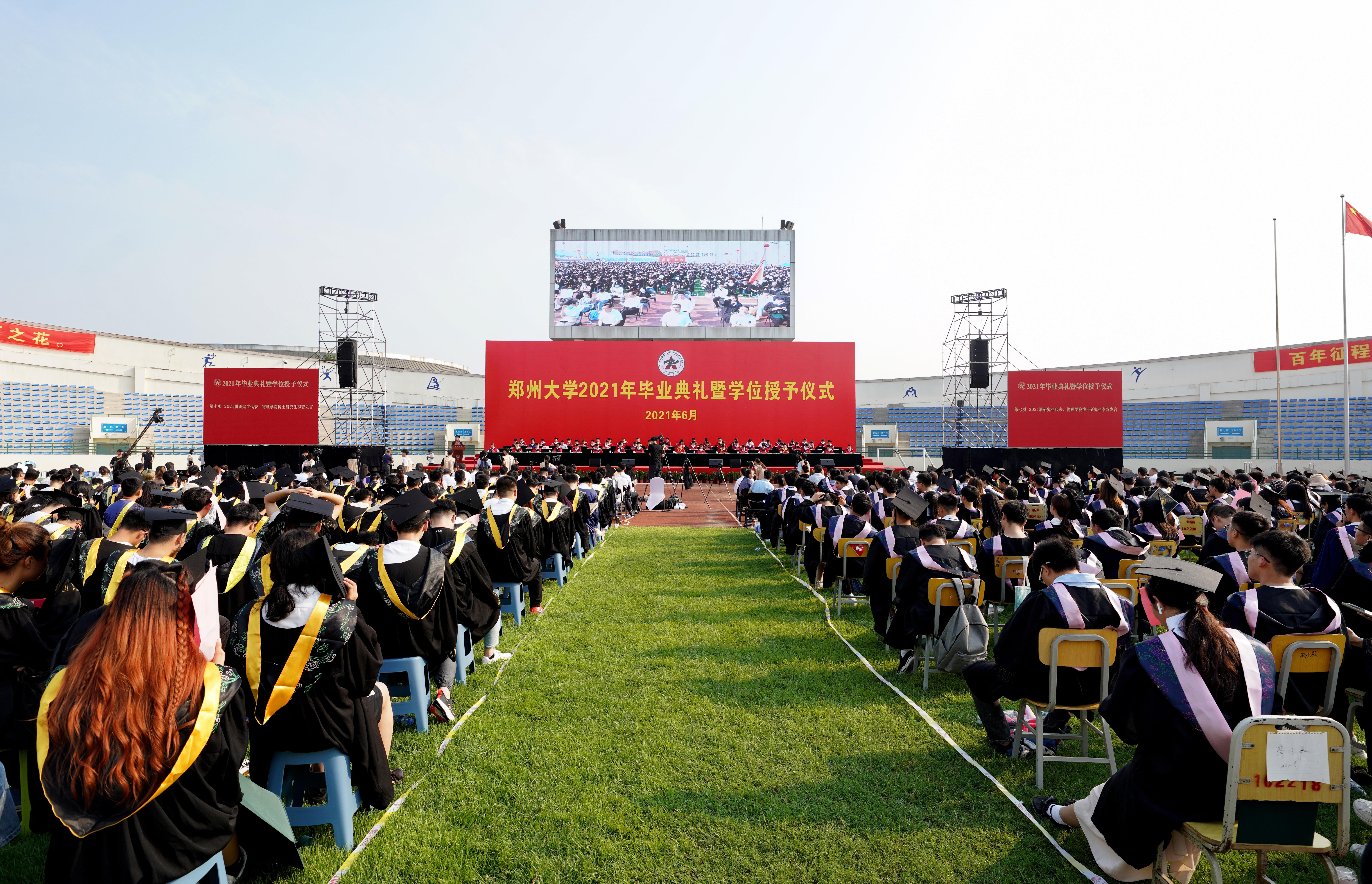百年征程波澜壮阔,百年初心历久弥坚;百年已是风雨兼程,百年正是风华正茂。6月28日上午,ac米兰官网中文网站2021年毕业典礼暨学位授予仪式在主校区本源体育场举行。典礼采取线上与线下相结合的方式进行。中国工程院院士张改平、中国社会科学院学部委员宋镇豪、中国科学院院士阎锡蕴,校领导宋争辉、刘炯天、王宗敏、屈凌波、李兴成、谷振清、吴宏阳、许东升、关绍康、韩国河、刘章锁、赵明皞、董子钢,校党委常委、总会计师徐东升,校学位委员会委员、各院(系)主要负责同志在主席台就坐,校内各单位主要负责同志、教师代表和主校区毕业生1.1余万人参加了毕业典礼。由于疫情防控需要,老校区及附属医院的毕业生采取线上方式参加典礼。典礼仪式由副校长张倩红主持。