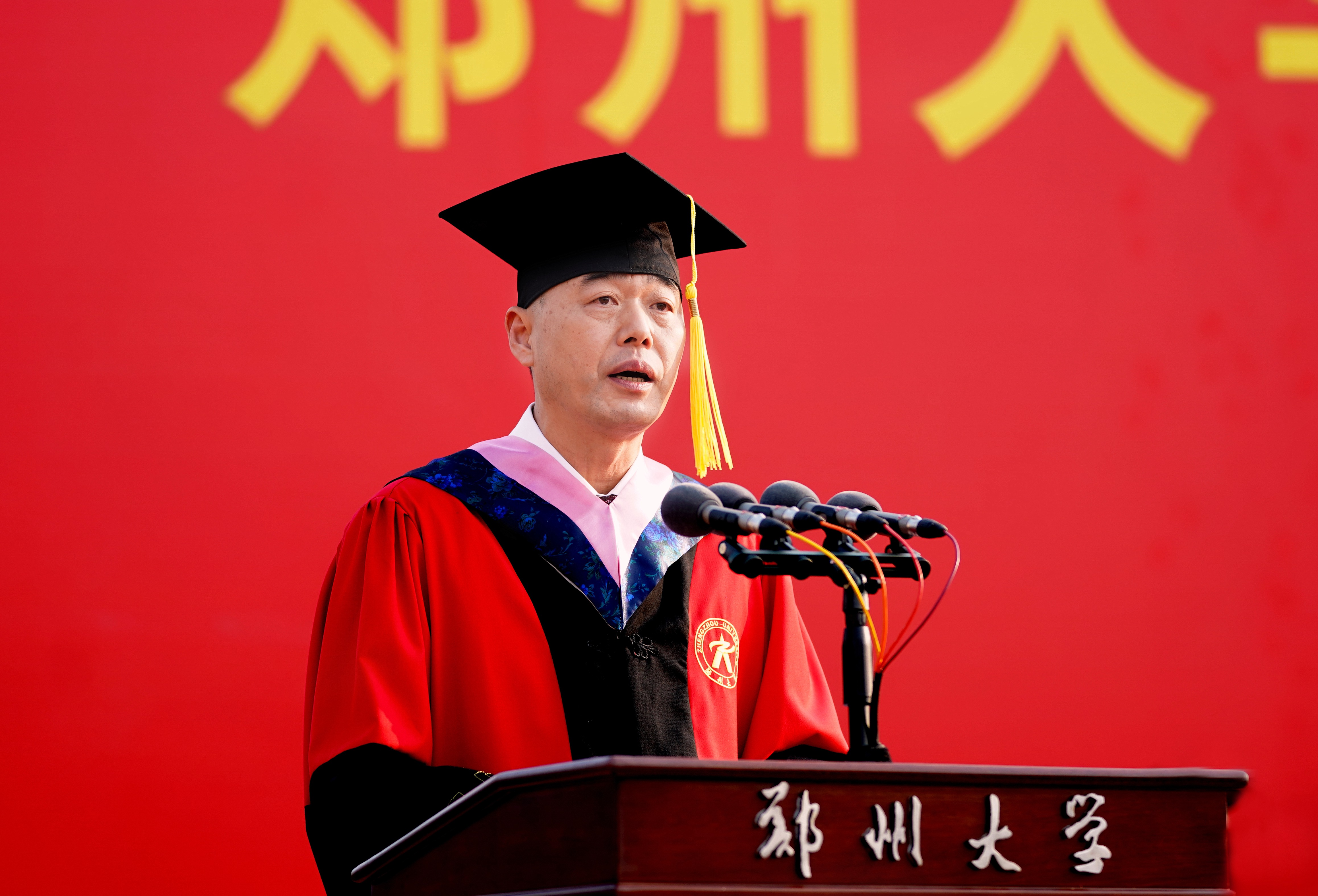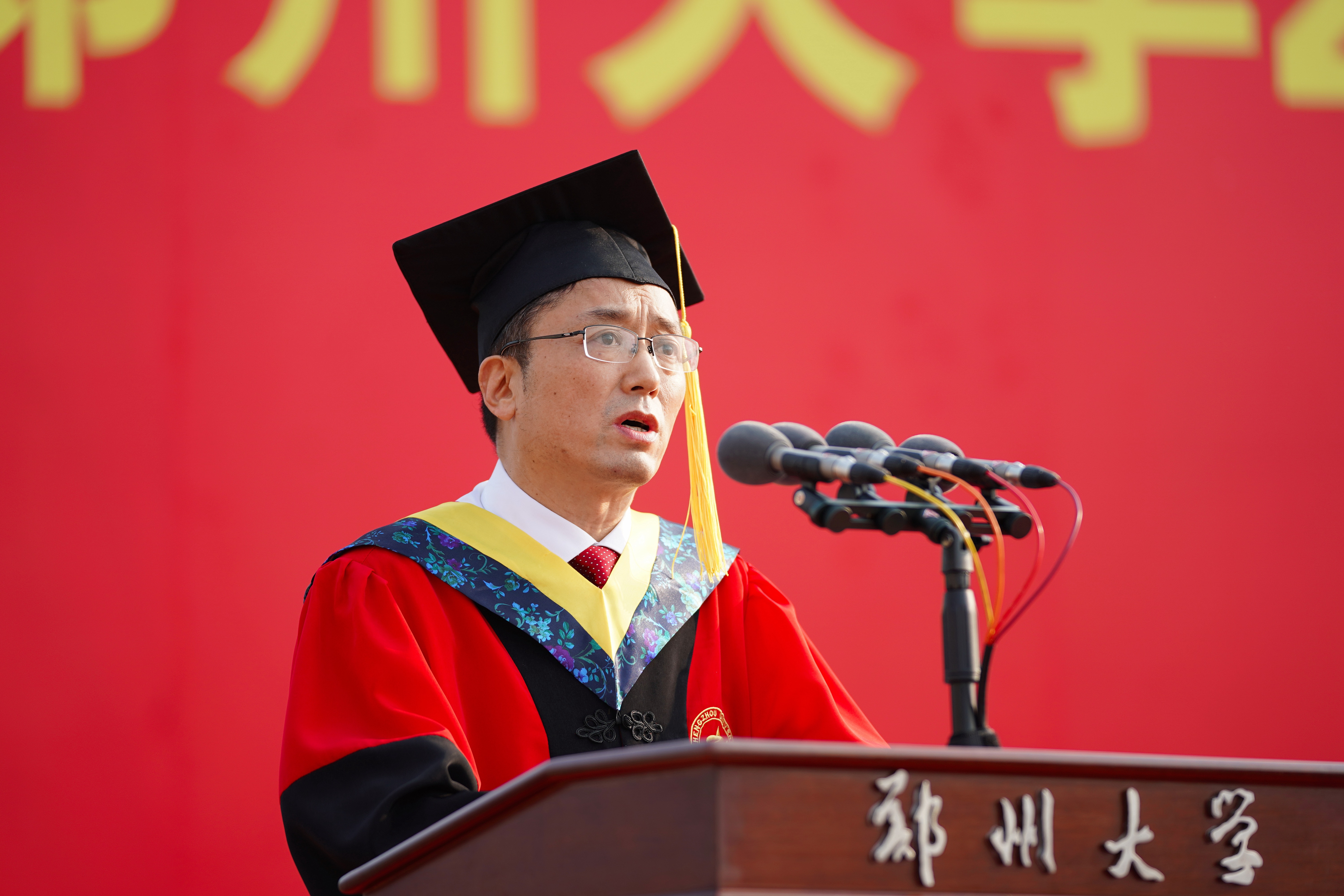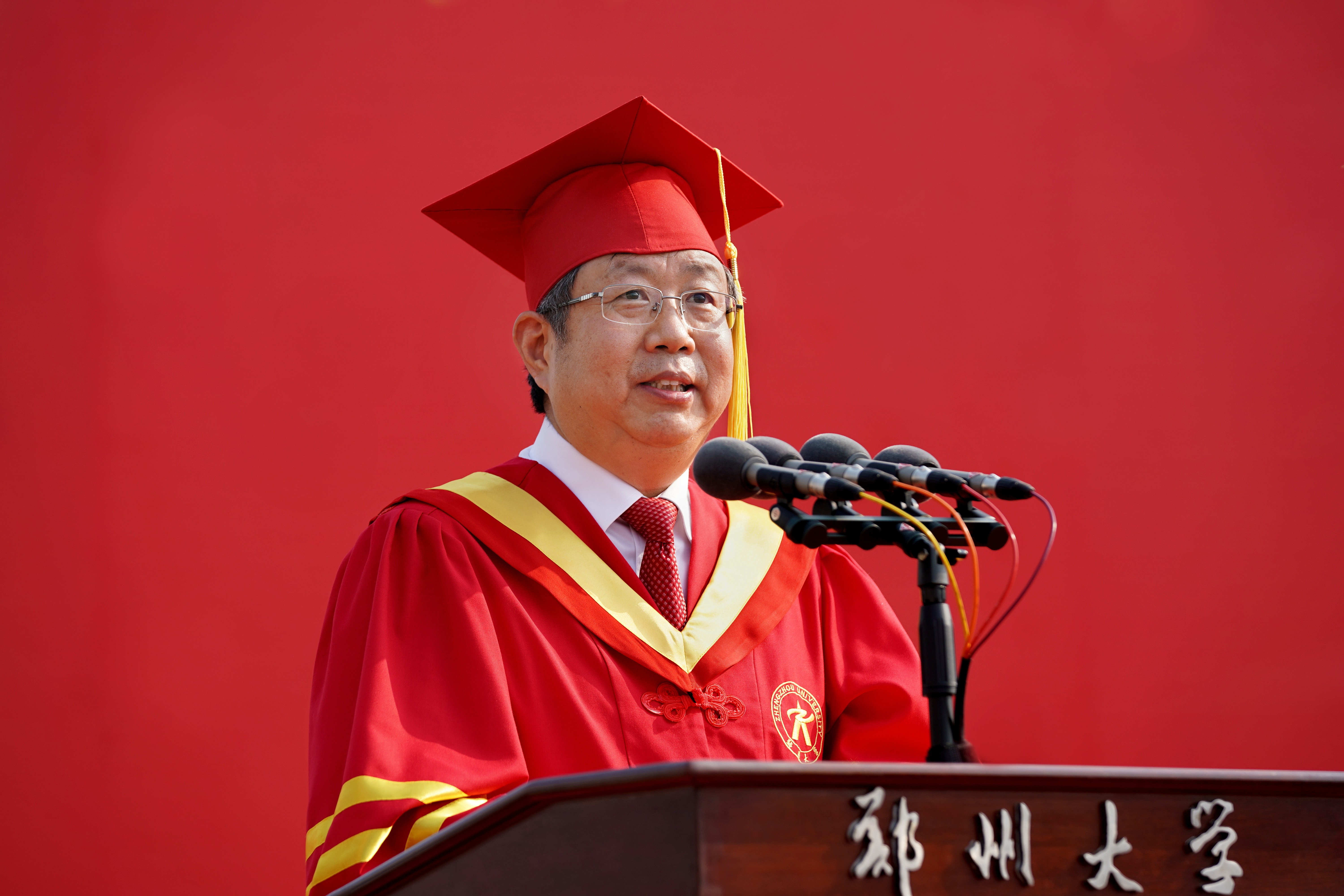 他讲到,八年多来,送给毕业生共八个字:自信、开放、尊重、坚韧;表达两层意思:文化与品格,以郑大之风,塑郑大人之格。今年又讲尊重,既是在说尊重教育与学会尊重,又通过党史教育与学校近百年办学历史学习,把尊重的认识与文化内涵提高到认识论与思想方法上,提高到履职尽责与家国情怀上,进一步丰满同学们的郑大人品格。
