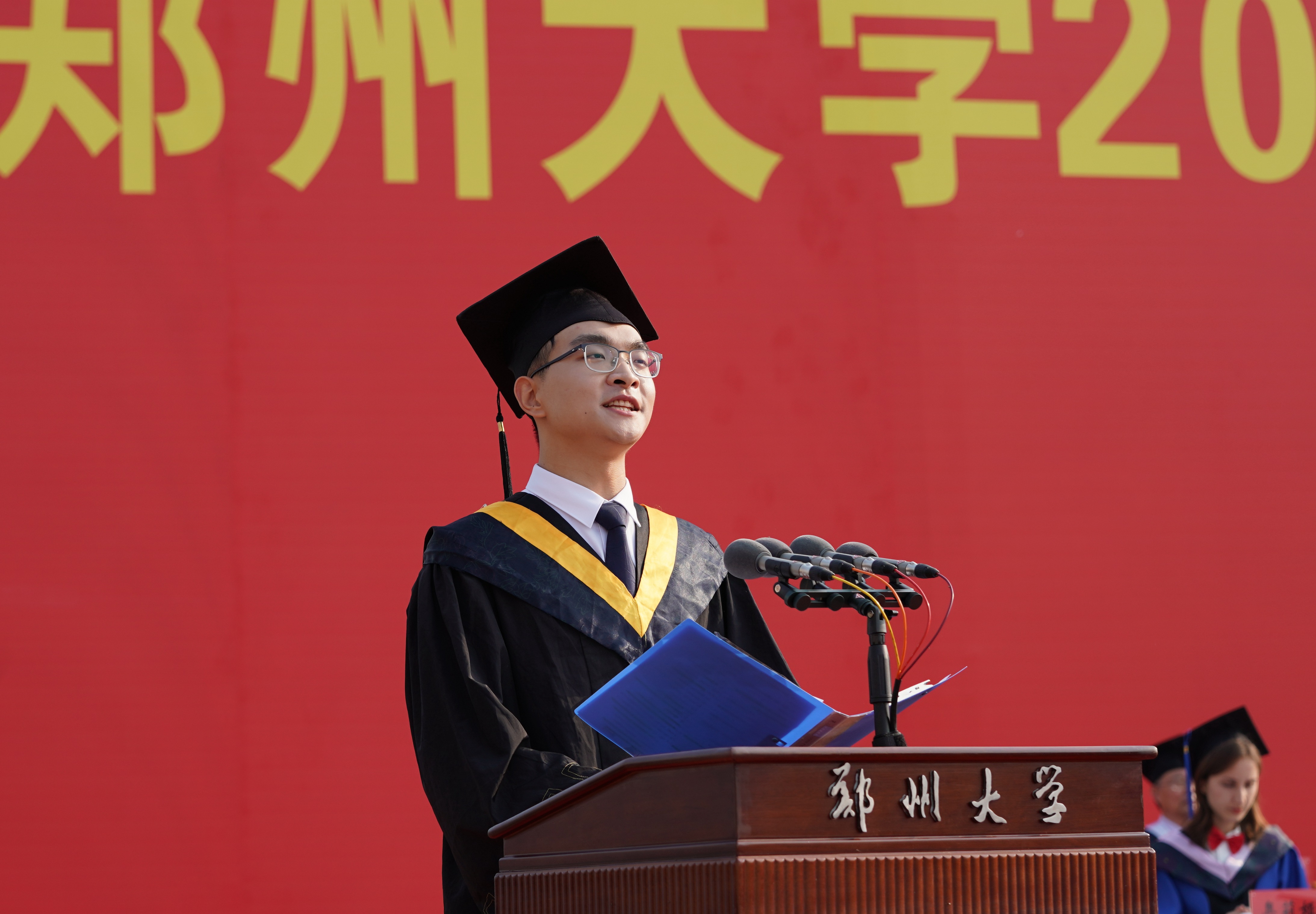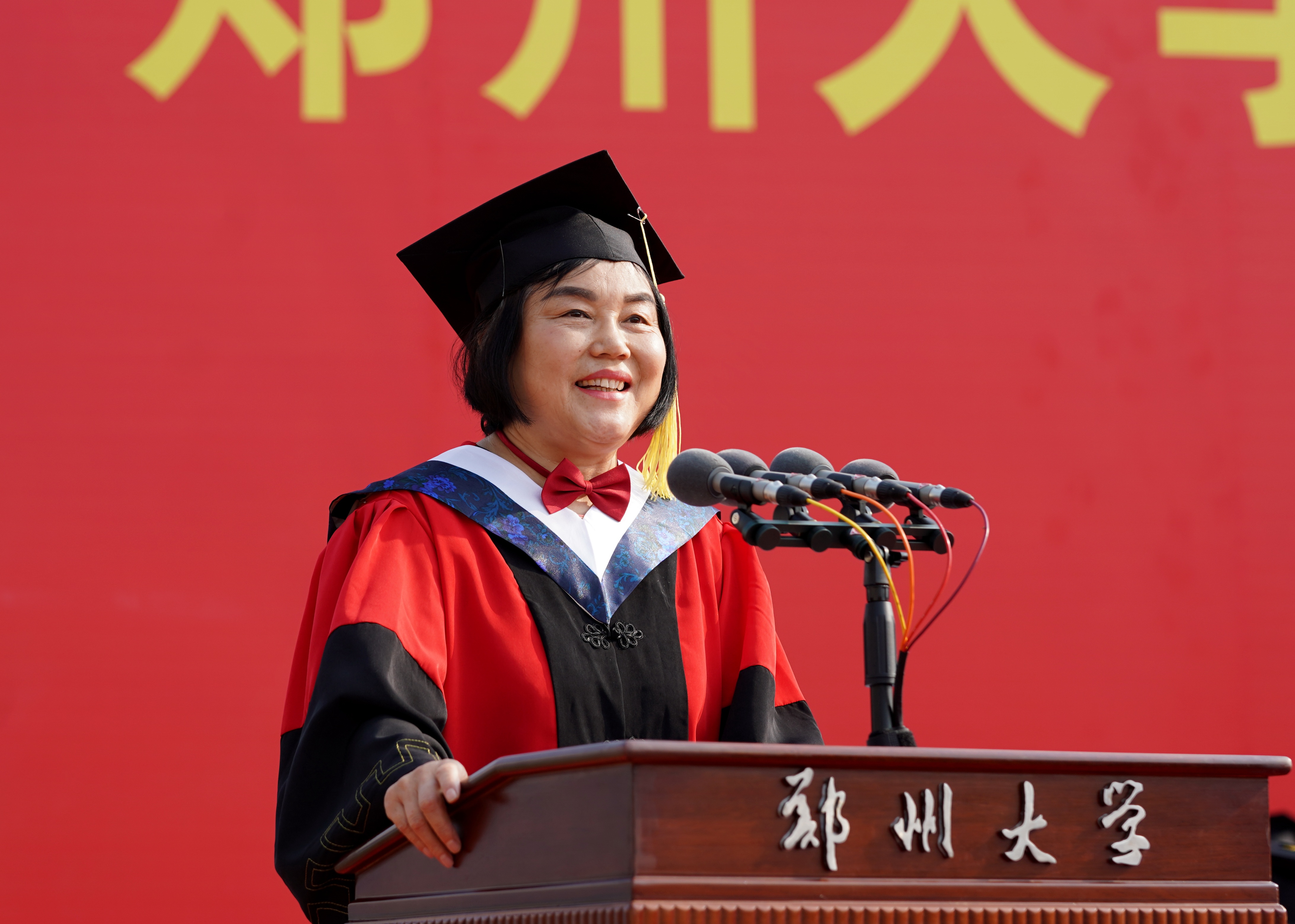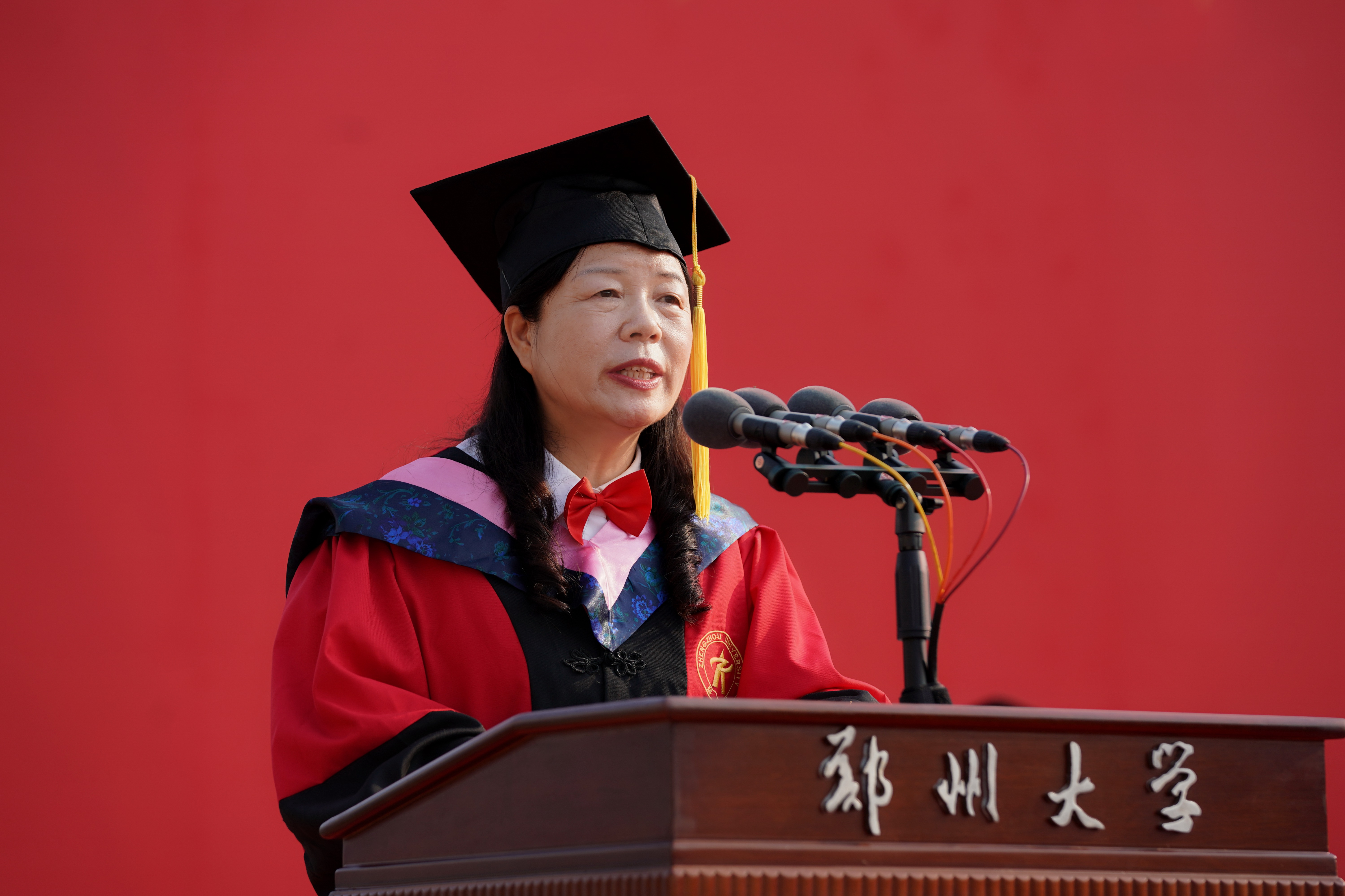 他讲到,八年多来,送给毕业生共八个字:自信、开放、尊重、坚韧;表达两层意思:文化与品格,以郑大之风,塑郑大人之格。今年又讲尊重,既是在说尊重教育与学会尊重,又通过党史教育与学校近百年办学历史学习,把尊重的认识与文化内涵提高到认识论与思想方法上,提高到履职尽责与家国情怀上,进一步丰满同学们的郑大人品格。