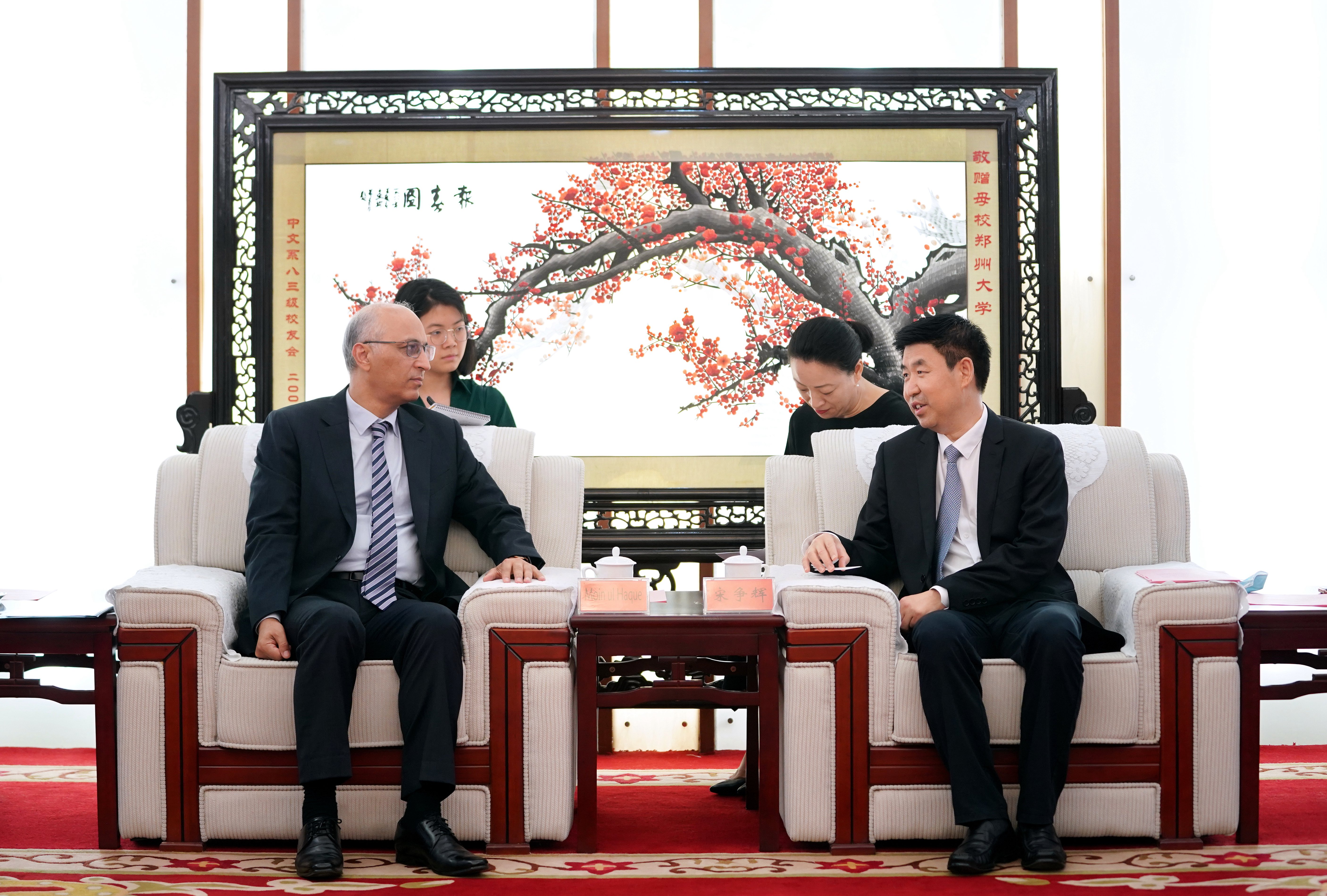 宋争辉对莫因·哈克大使一行的到来表示欢迎,并简要介绍了ac米兰官网中文网站一流大学建设基本情况。他指出,今年是中国共产党成立100周年,也是中巴建交70周年,中巴两国是全天候的战略合作伙伴关系,巴基斯坦是中国人民的“铁杆朋友”,ac米兰官网中文网站通过学术交流、留学生教育等形式不断深化与巴方高校间的合作,支持中巴经济走廊建设,助力打造“一带一路”合作交流的名片。他表示,学校将以莫因·哈克大使此行为契机,深化与巴基斯坦的教育交流,为助力河南与巴基斯坦的合作发挥更大作用。
