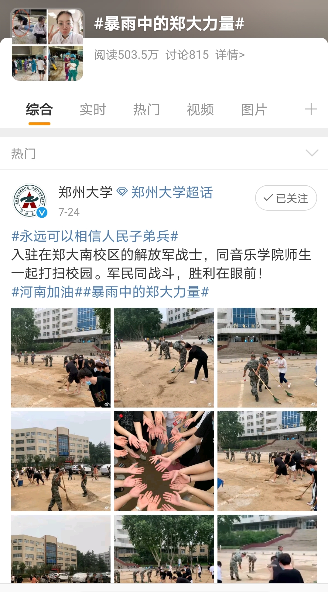 暴雨中,有他们闪烁的身影;洪流里,有他们抢险的英姿;宿舍、教室、餐厅、医院、实验室……有他们并肩战斗的足迹;暴雨后,校园部分区域一片“狼藉”,师生齐心协力,重塑校园的美丽。他们是可爱可敬的郑大人!他们心中的信念始终在熠熠闪光,那就是生命至上,师生至上,使命至诚!这是弘扬伟大抗洪精神和抗疫精神的礼赞,这是郑大人学史力行的生动彰显!