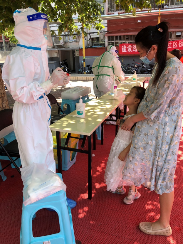 8月3日,郭静静恰好被分配到自家小区进行采样,其5岁的女儿排队时,面对全副武装的妈妈,开始没有认出来,好奇地笑,听出是妈妈的声音后立刻问妈妈:“妈妈,你的这个大眼睛(面屏)是干啥的?妈妈你为啥不抱抱我?”……最终,孩子在哭闹中做完了核酸采样。