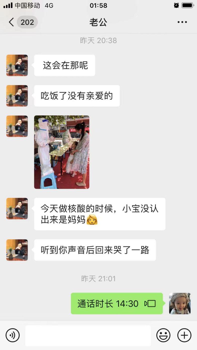至今,郭静静仍奋战在采样一线,她不敢和孩子视频, 因为“害怕孩子哭闹”。每天忙完工作后,和很多奋战在采样一线的年轻妈妈一样,她会一遍遍地刷手机里孩子的视频。