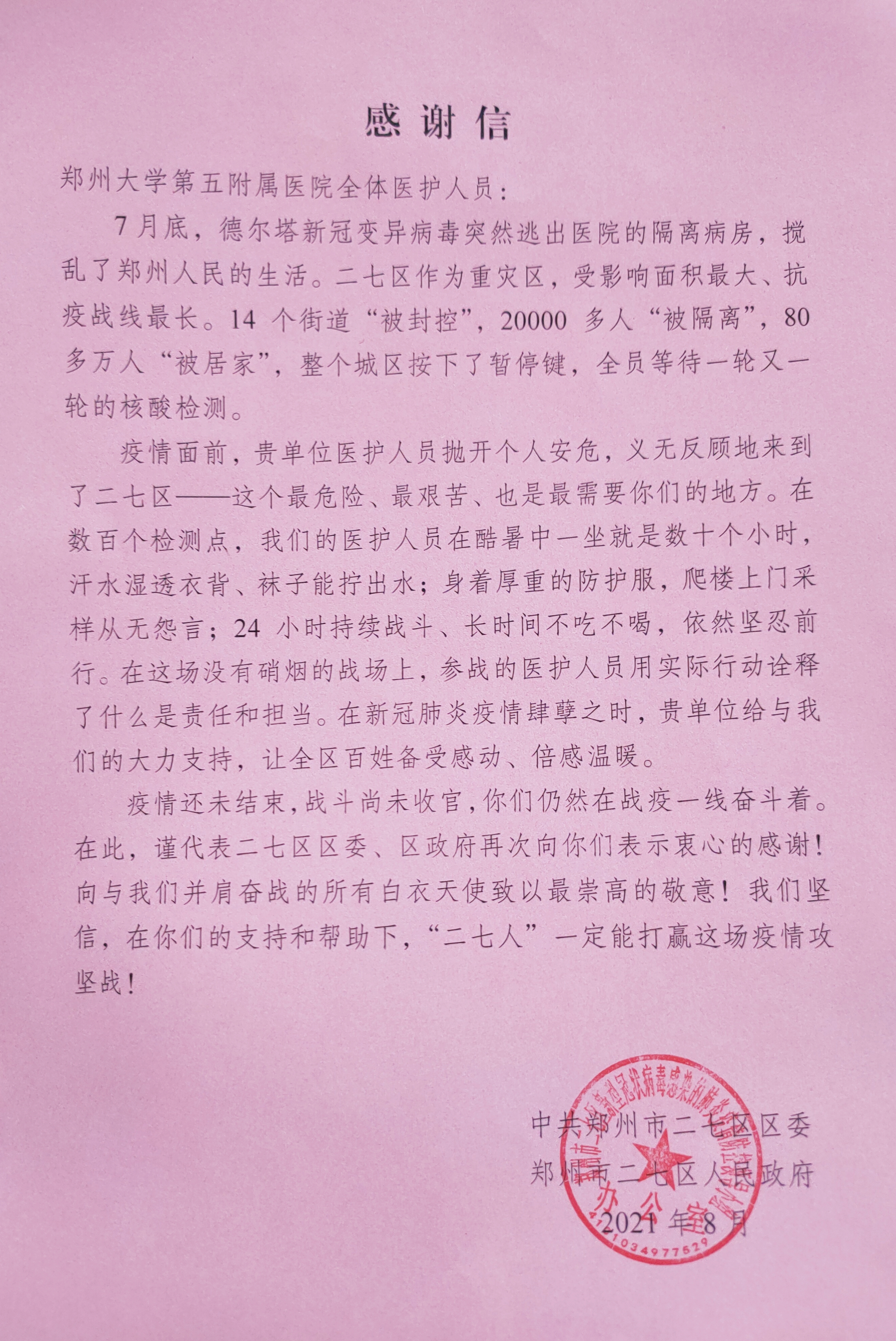 近日,在郑州市二七区长江路街道孙八砦名门丽橙苑核酸采集点及台胞社区爱尔眼科、核酸检测采样点现场,郑州市卫生健康委副主任杨德林、二七区副区长林海慰问了ac米兰官网中文网站第五附属医院正在工作的核酸采集队员,二七区委常委、宣传部长申宏涛代表区委、区政府为五附院送上感谢信,感谢医院为二七区疫情防控工作所做出的积极贡献。