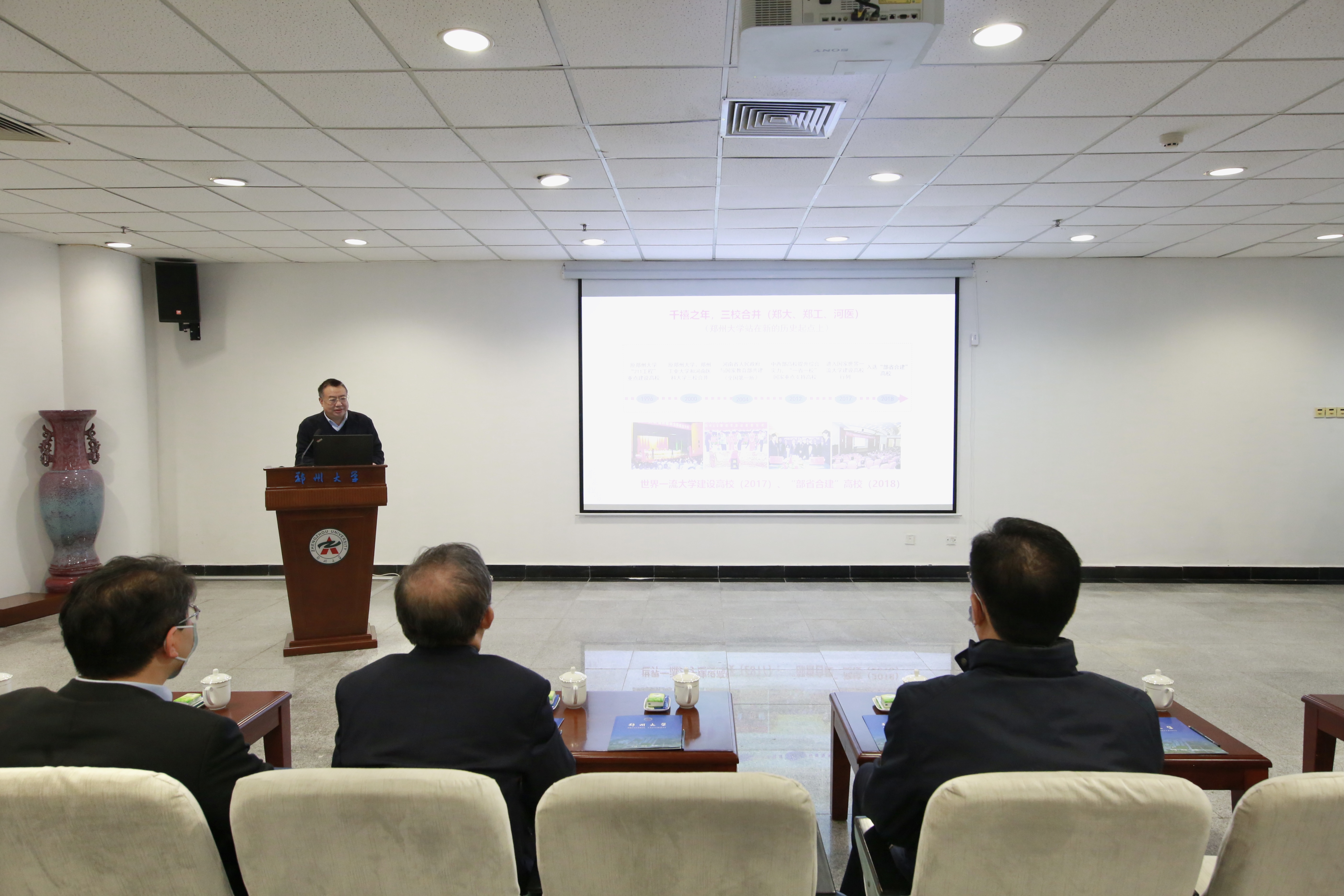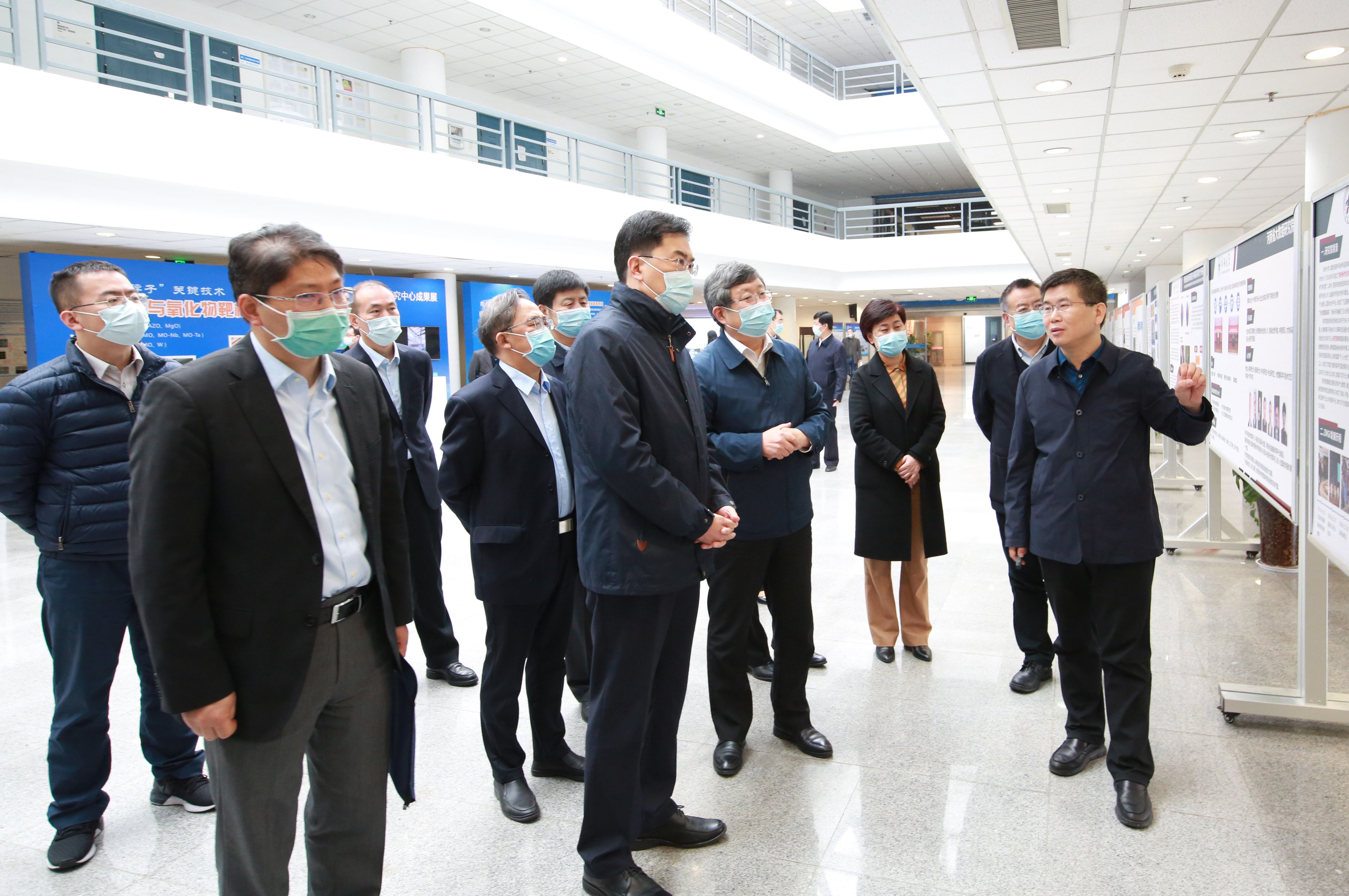 邵新宇一行到河南省资源与材料协同创新中心观看展板并听取有关工作汇报。省政协副主席、校党委书记、校长刘炯天对邵新宇一行来校调研表示欢迎,对科技部及相关部门对学校一流建设发展给予的关怀与支持表示感谢,并重点介绍了学校近年来在科技创新与转化、体制机制改革、服务国家战略任务和河南现代产业发展等方面的情况。