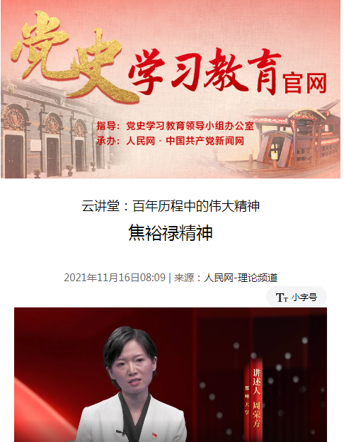 为庆祝中国共产党百年华诞,引导广大人民群众特别是青少年加深对党的历史的理解和把握,让红色基因、革命薪火代代传承,人民网·中国共产党新闻网联合教育部高等学校社会科学发展研究中心出品“百年历程中的伟大精神”系列云讲堂。我校周荣方老师作为河南省唯一一位主讲人,受邀参与录制“红旗渠精神”“焦裕禄精神”两节党史思政课,为全国人民动情讲述发轫于中原大地的中国共产党伟大精神。