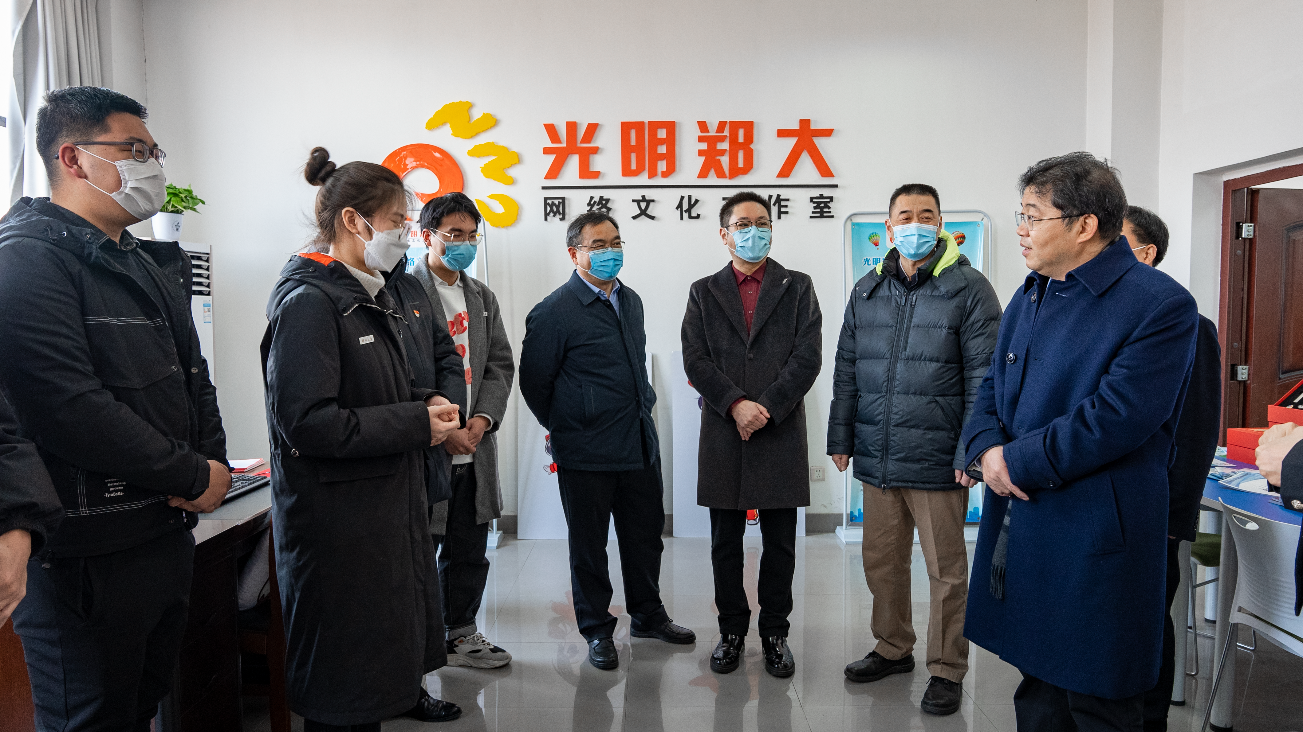 最后,张文斌一行到“光明郑大”网络文化工作室,听取相关同志对我校网络文化工作的介绍,查看工作室近年来取得的成绩展示。“光明郑大”网络文化工作室自2015年被确定为教育部首批培养对象之一以来,立足学校特色,聚焦学生成长需求,依托师生骨干力量,以网络主题活动策划、网络服务供给、网络文化产品创制为重点,催生网络文化成果,发挥示范引领作用,多次被教育部通报表扬。张文斌勉励工作室指导老师及同学们要脚踏实地,共同守护文明健康的网络家园。