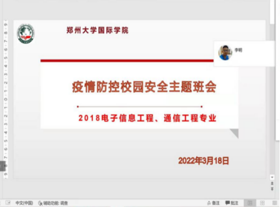 为贯彻落实习近平总书记关于疫情防控重要讲话精神,以及教育部、省委教育系统工作专班、郑州市有关疫情防控会议精神,3月17日党委学生工作部、学生处召开全体学工系统疫情防控会议,传达学校疫情防工作的安排部署。会议结束后,各院系迅速行动、积极响应,先后开展了形式多样的疫情防控主题班会。