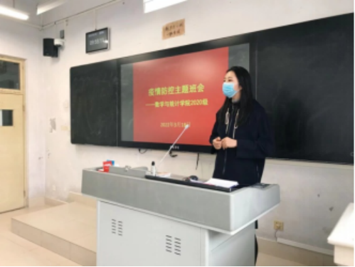 数学与统计学院结合专业特色及各年级学生特点,量身订制了一场场精彩的主题班会。通过介绍疫情防控常态化各项管理规定,深入探讨新时代大学生面对疫情如何践行社会责任;通过集体线观看疫情工作一线的优秀事迹,引导学生提升责任和使命感;通过开展疫情下的心理健康教育,帮助有困难、心理有压力的学生、化解思想困惑,做好心理疏导个人文关怀。班会结束后,各班级根据活动开展情况,从活动内容、参与情况、感想收获等方面进行总结,发挥良好宣传及教育作用。