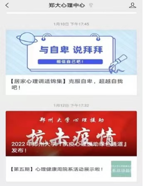 同时,“郑大心理中心”微信公众号开设“时间管理”“职业规划”“自我成长”“学习适应”“人际关系”“友情与爱情”等话题板块。其中由中心专兼职教师主讲的“压力与情绪调节”“积极适应与成长”“不良情绪的识别与疏导”“应对恐慌”等专题讲座视频可以不限次数回放观看。开展“正念情绪调适小课堂”等网络团体心理辅导,开设《大学生心理健康教育教程》课程。暖心的服务和专业心理疏导干预,缓解了同学们就业压力、考研压力、调剂压力和防疫压力,守护了学生身心健康。