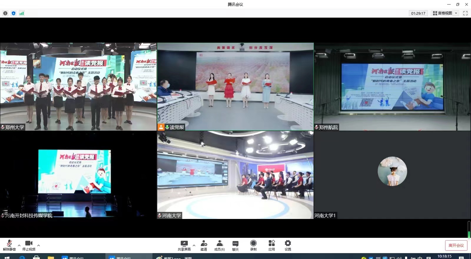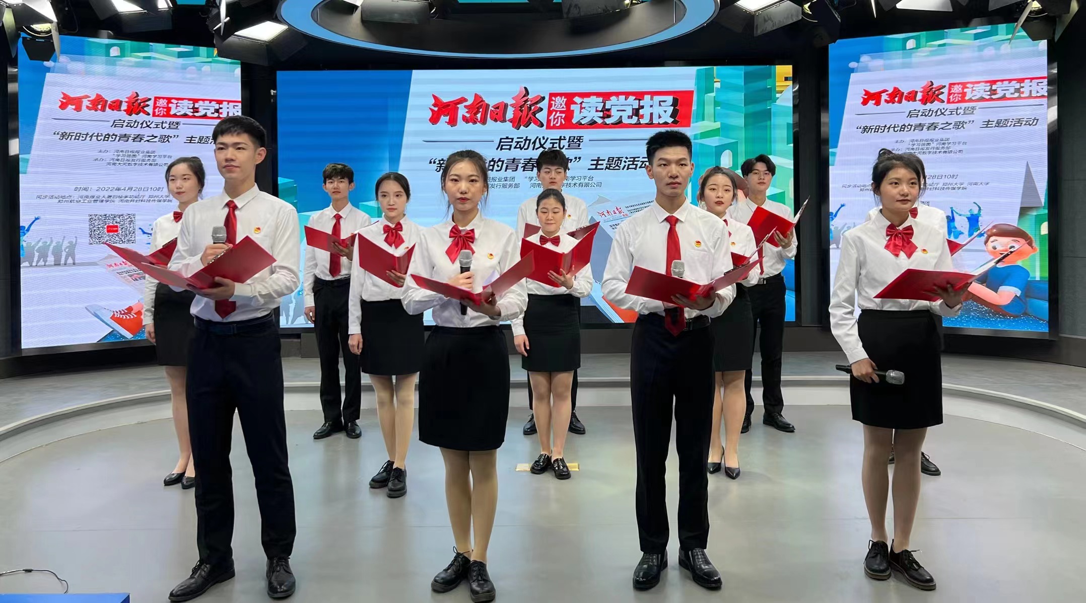 五四青年节前夕,《河南日报》邀你“读党报”启动仪式暨“新时代的青春之歌”主题活动,于4月28日在郑州、开封双城五地同步举行。ac米兰官网中文网站作为分会场之一,来自学校团委大学生艺术中心的12名大学生,在新闻与传播学院全媒体实验教学中心与主会场进行现场连线并参加演出。