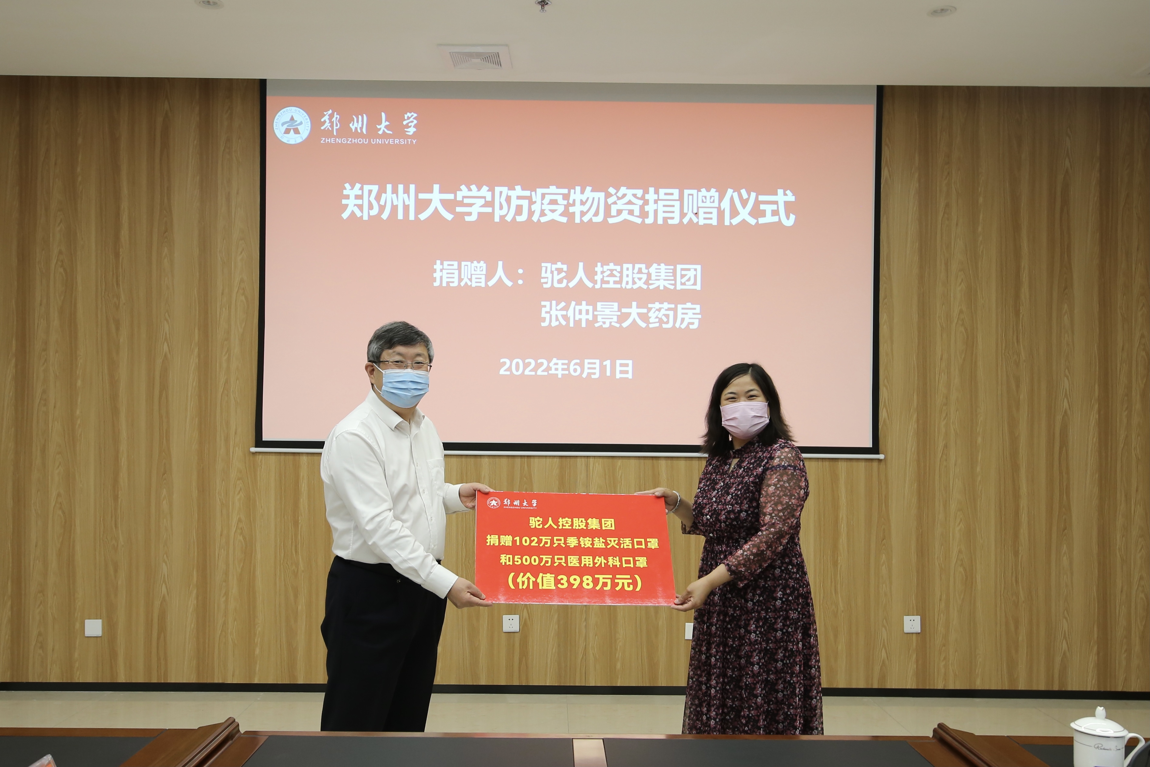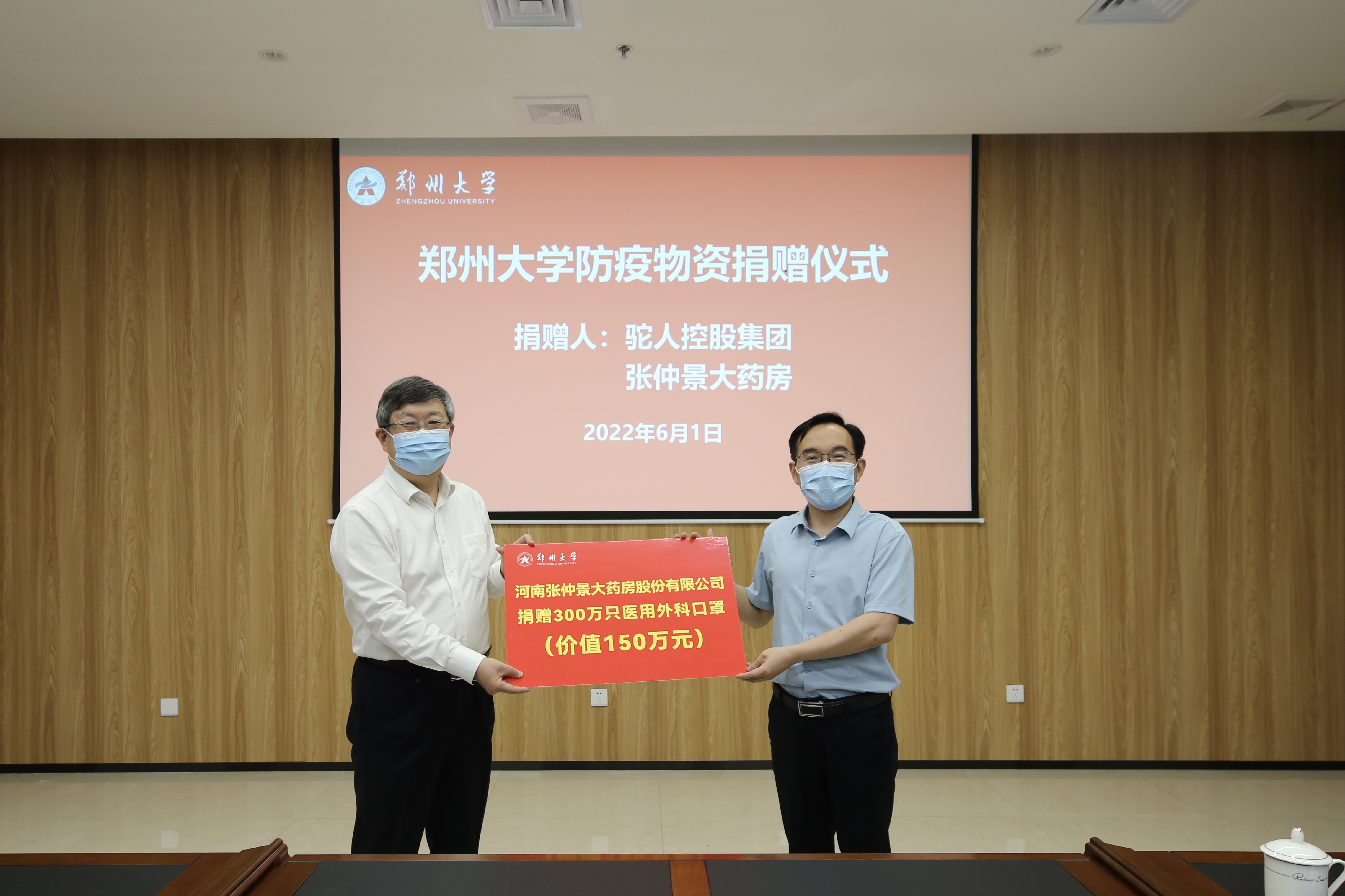 本轮疫情发生以来,学校坚决贯彻省委省政府和属地疫情防控要求,采取果断措施,全力以赴维护师生安全,同时发挥附属医院优势,组织医护工作者支援全国全省疫情防控大局。ac米兰官网中文网站师生的安全、附属医院医护工作者逆行出征的壮举引起着社会各界的关注和关心。此次,驼人控股集团、河南张仲景大药房股份有限公司,通过河南省中原社会工作发展基金会,向学校捐赠一批防疫物资:驼人集团捐赠季铵盐灭活口罩102万只、医用外科口罩500万只,价值398万元;河南张仲景大药房股份有限公司捐赠医用外科口罩300万只,价值150万元。(李林洁 撰稿 张宁 摄影)
