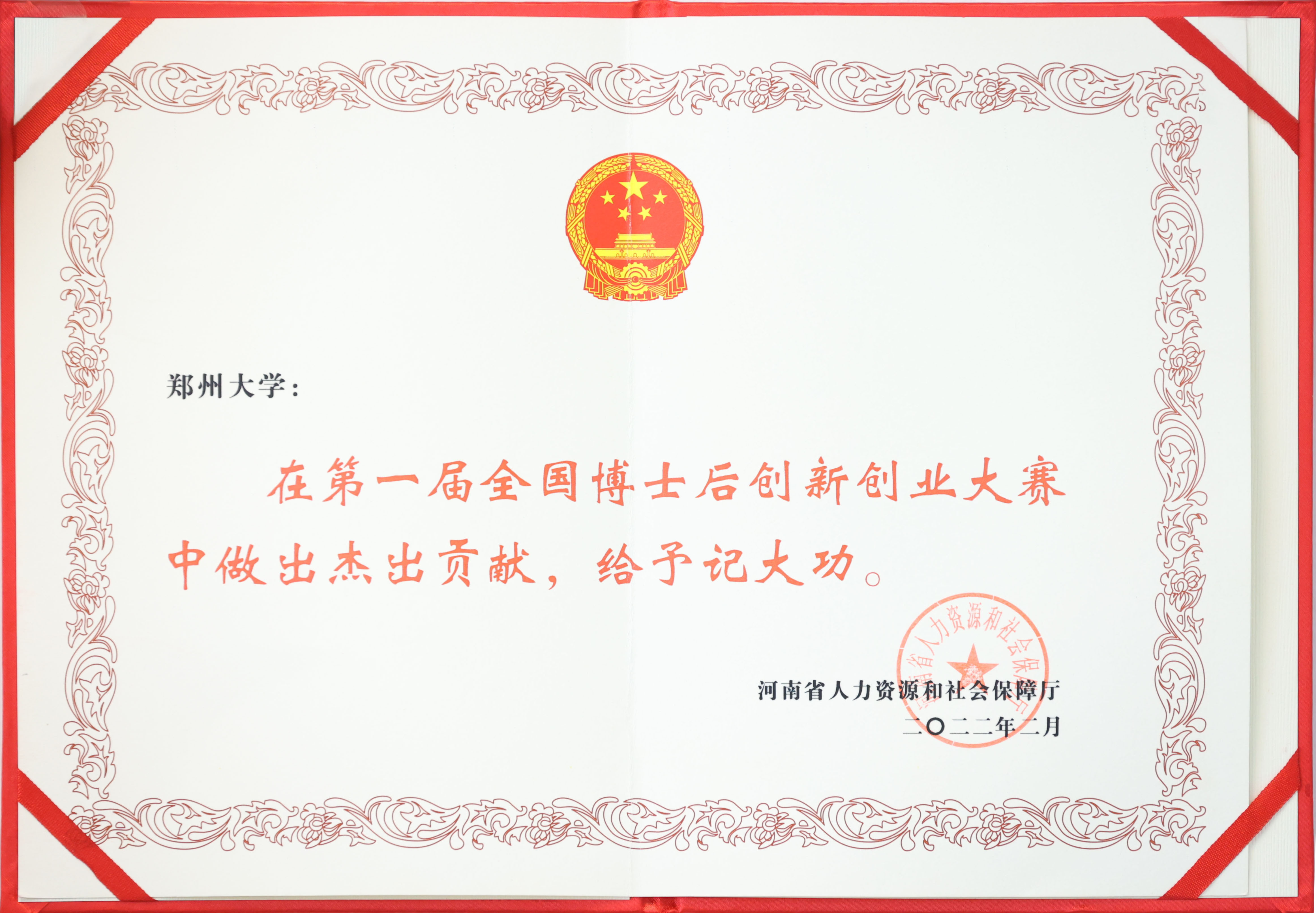 近日,河南省第一届全国博士后创新创业大赛表彰暨推进博士后工作高质量发展会议在郑州召开。ac米兰官网中文网站因在第一届全国博士后创新创业大赛中成绩突出,被河南省人力资源和社会保障厅给与集体记大功,创业大赛金奖获得者王念念博士受到个人嘉奖。