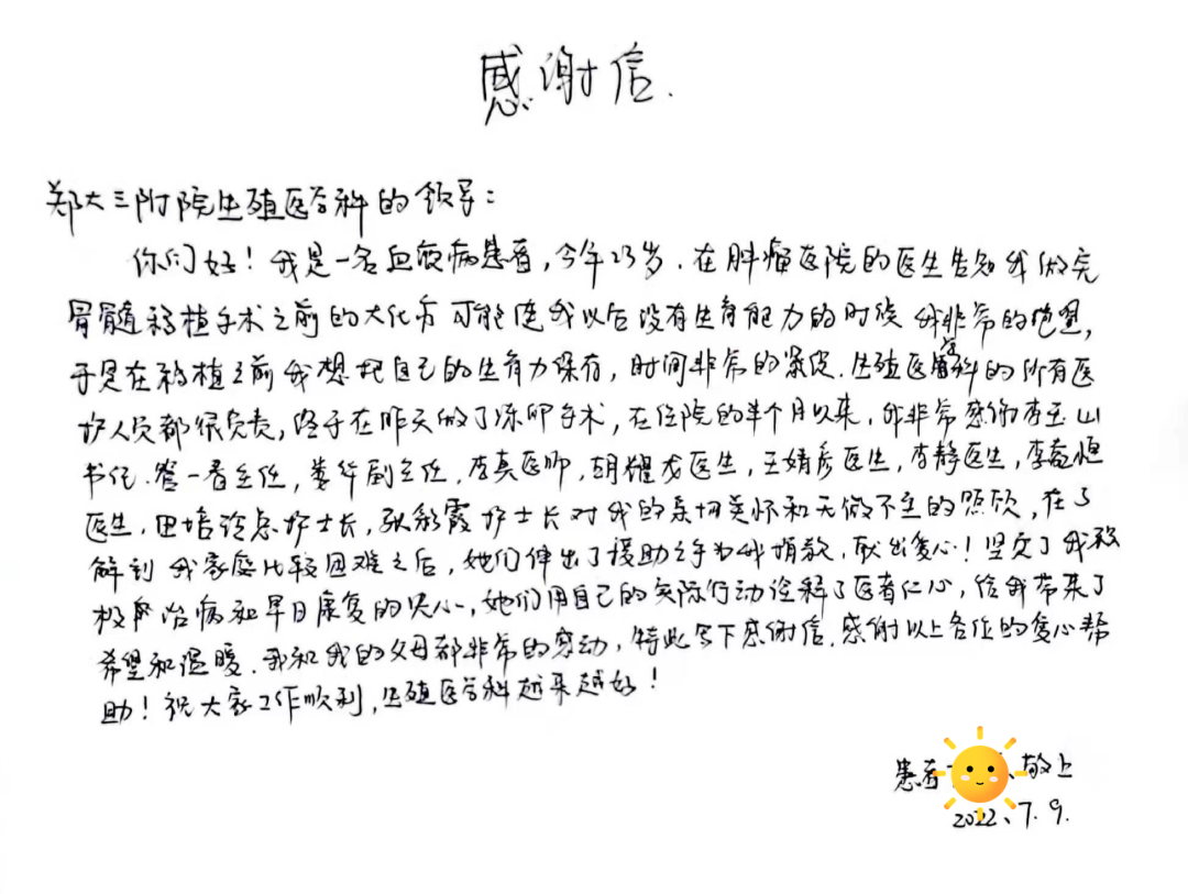 治疗白血病进行造血干细胞移植花费较大,这对于原本清贫的家庭来说无异于雪上加霜,懂事的小京几度想放弃,不愿为父母增加额外的负担。获悉这一情况后,医院积极号召大家帮助小京,医护人员甚至很多患者不约而同地将爱心传递,最终共募捐了近2万元善款。一份爱心,无形中抚慰了小京被突发疾病击垮的内心,编织一份情,更通过生育力保存技术为她带来了生的希望。当晚,小京为医院写了一封感谢信。