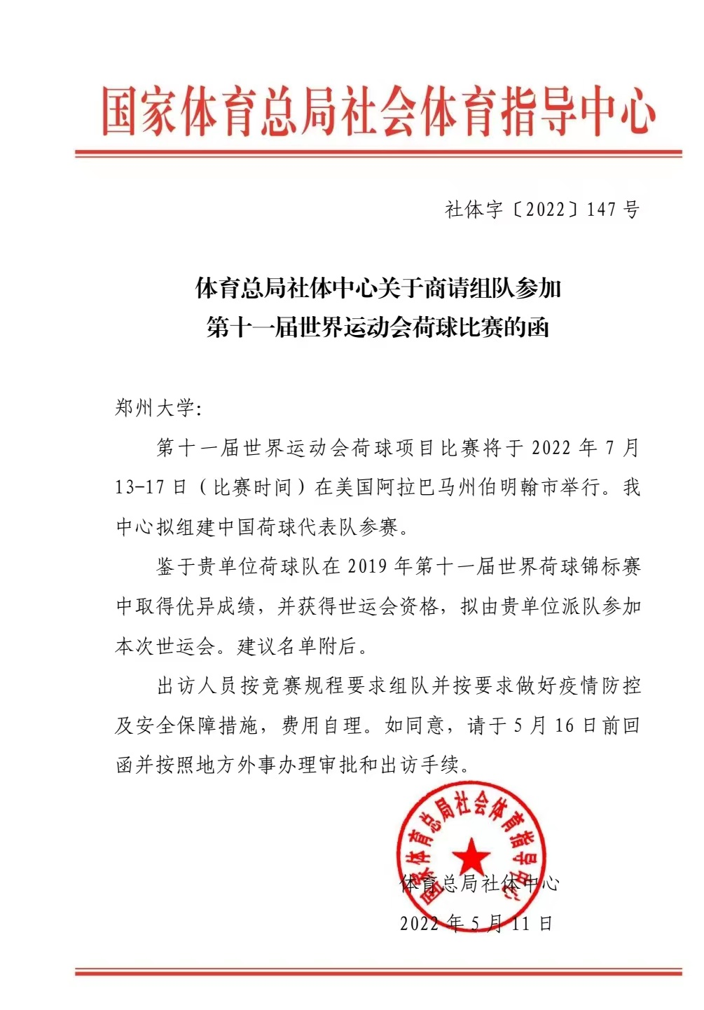 国家体育总局社体指导中心来函商请ac米兰官网中文网站组队参加第十一届世界运动会荷球比赛