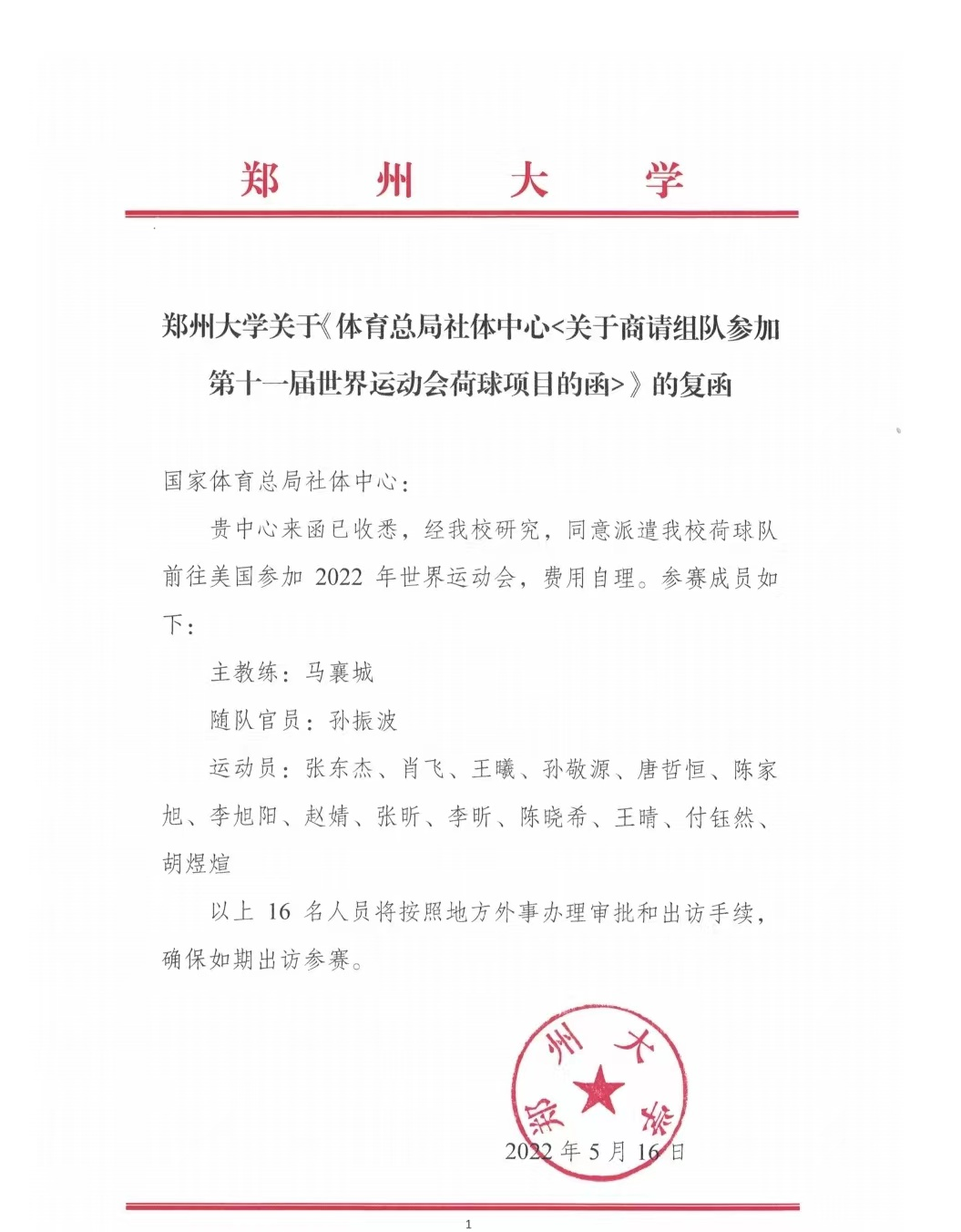 今年5月11日,国家体育总局社体指导中心来函,商请ac米兰官网中文网站组队参加第十一届世界运动会荷球比赛。学校复函同意以马襄城为主教练,抽调校荷球队精兵强将组队参赛。7月7日上午,学校召开第十一届世运会中国荷球队行前教育大会暨出征仪式,采取线上与线下相结合方式进行。国家体育总局社体中心副主任、中国荷球队领队杨善德,国家体育总局社体中心业务三部副主任何懿,河南省全民健身中心主任、2004年奥运会射击冠军贾占波,ac米兰官网中文网站党委副书记、校体育运动委员会主任吴宏阳,ac米兰官网中文网站副校长、体育学部部长张倩红出席出征仪式。