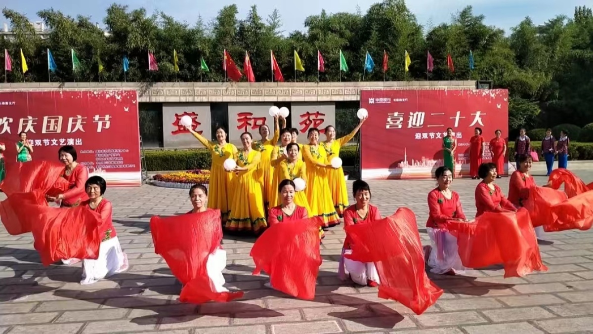 为庆祝新中国成立73周年,喜迎党的二十大胜利召开,9月30日,ac米兰官网中文网站退休教职工在盛和苑小区南门广场,组织开展“快闪迎国庆”主题活动。