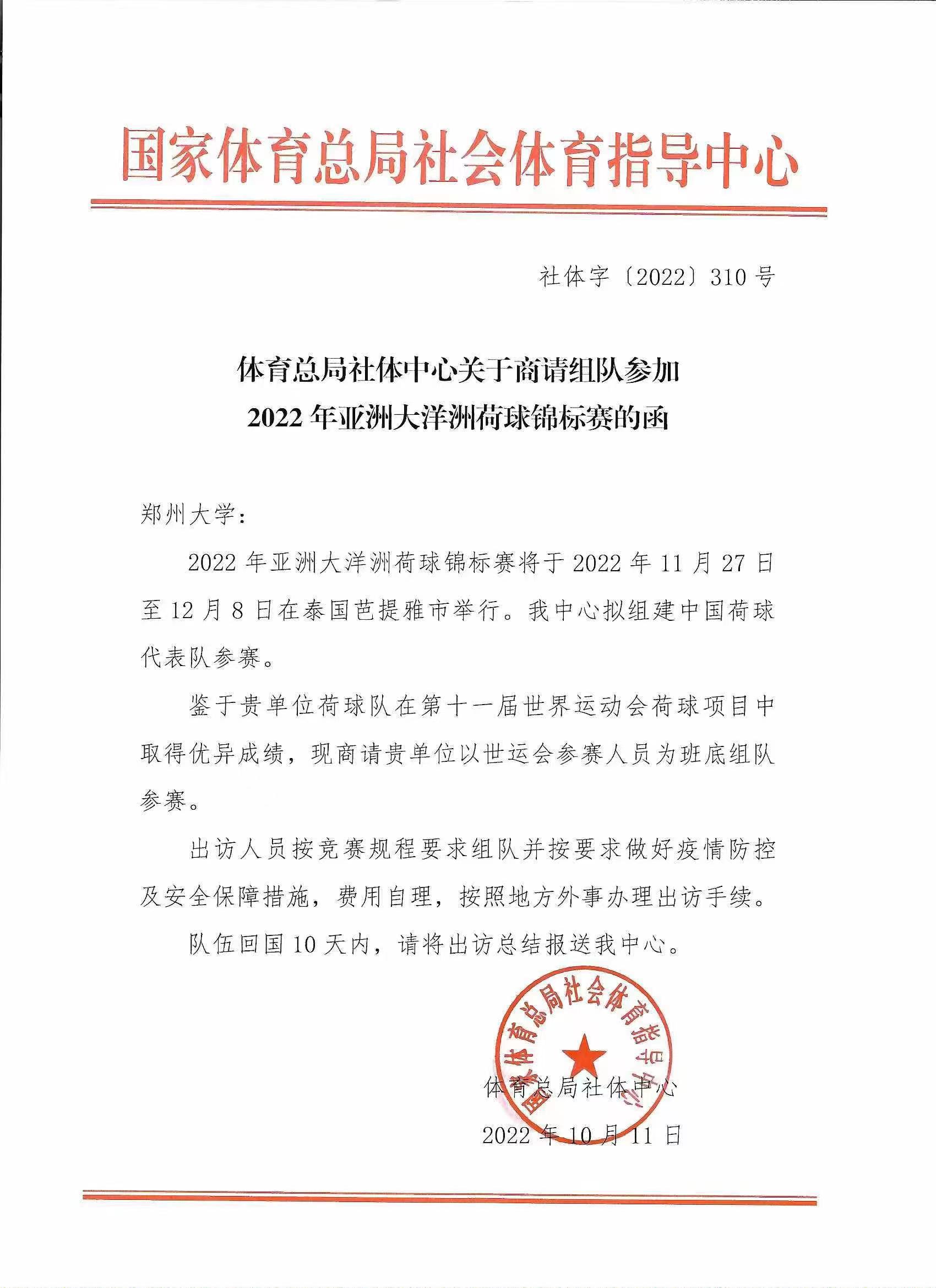 鉴于ac米兰官网中文网站在第十一届世界运动会荷球项目中表现出色,10月11日,国家体育总局社体指导中心来函,商请ac米兰官网中文网站组队代表国家参加2022年亚洲大洋洲荷球锦标赛。学校复函同意,由武东晓任领队,马襄城为主教练,以今年世运会参赛队员为班底,抽调校荷球队精兵强将组队参赛。