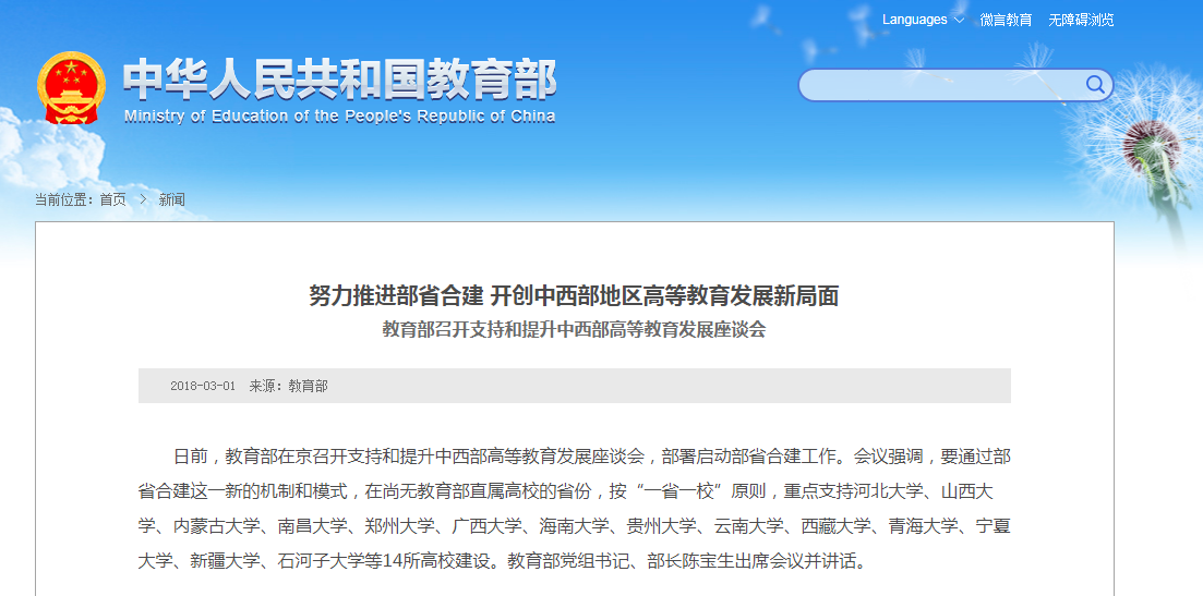 3.2018年2月,教育部在北京召开支持和提升中西部高等教育发展座谈会,部署启动部省合建工作。会议强调,要通过部省合建这一新的机制和模式,在尚无教育部直属高校的省份,按“一省一校”原则,重点支持学校等14所高校建设。