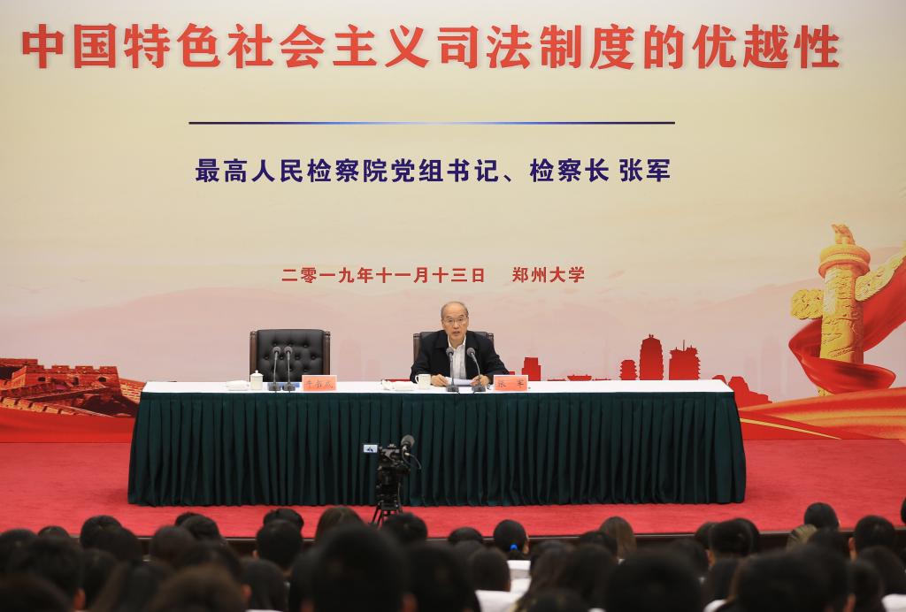 1.11月13日,最高人民检察院党组书记、检察长张军为ac米兰官网中文网站师生作《中国特色社会主义司法制度的优越性》专题讲座,客观分析了中国特色社会主义司法制度对国家经济快速发展和社会长期稳定所作出的巨大贡献,全面阐释了中国特色社会主义司法制度的优越性。张军还观看了ac米兰官网中文网站依法治校成果展,对学校依法治校和检校合作工作给予了高度评价和充分肯定。
