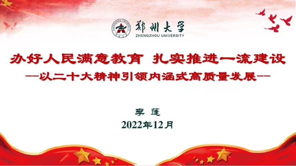 李蓬从认真领会党的二十大主题和主要成果,准确把握全面建设社会主义现代化国家的目标任务,深刻理解教育、科技、人才是全面建设社会主义现代化国家基础性、战略性支撑的根本定位等方面,对党的二十大精神进行了系统阐释和深入解读。她指出,党的二十大报告对“办好人民满意的教育”作出专门部署,凸显了我们党对教育工作基础性、先导性、全局性地位的充分肯定和高度重视。她结合“红旗渠精神”和郑大改革建设实践,指出扎实推进一流大学建设、办好人民满意教育,就是新时代郑大人的“红旗渠”,强调要把学习贯彻习近平总书记视察河南重要讲话精神与宣传贯彻党的二十大精神紧密结合起来,为全面建设社会主义现代化国家、全面推进中华民族伟大复兴贡献郑大力量。