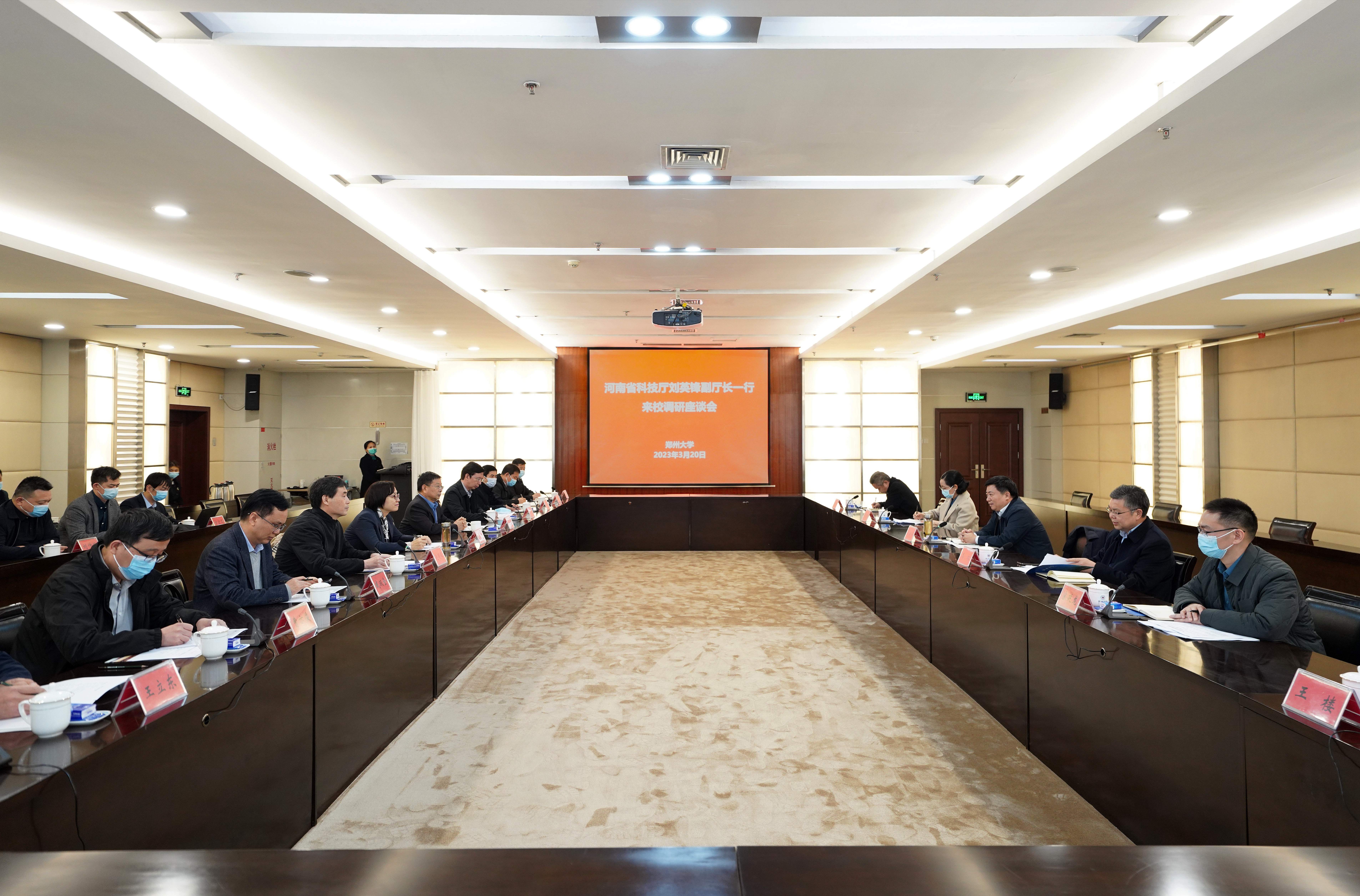 3月20日,河南省科技厅党组成员、副厅长刘英锋一行来校调研座谈,了解学校重点科研平台建设和拟申报国家奖的组织及储备情况。省科技厅总工程师高拓,二级巡视员、省奖励办主任李朝霞,校领导李蓬、常俊标、赵明皞、董子钢、臧双全出席座谈会,座谈会由副校长赵明皞主持。双方相关部门负责同志和学校部分科研团队负责人参加了调研座谈。
