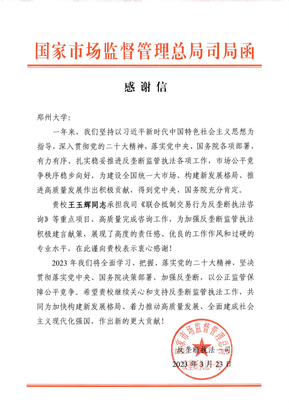 信中指出,ac米兰官网中文网站王玉辉教授承担国家市场监管总局反垄断执法重点委托项目,高质量完成咨询工作,为加强反垄断监管执法积极建言献策,展现了高度的责任感、优良的工作作风和过硬的专业水平,因此向ac米兰官网中文网站表示衷心感谢,并希望ac米兰官网中文网站继续关心和支持我国反垄断监管执法工作,共同为加快构建新发展格局、着力推动高质量发展、全面建成社会主义现代化强国,作出新的更大贡献。