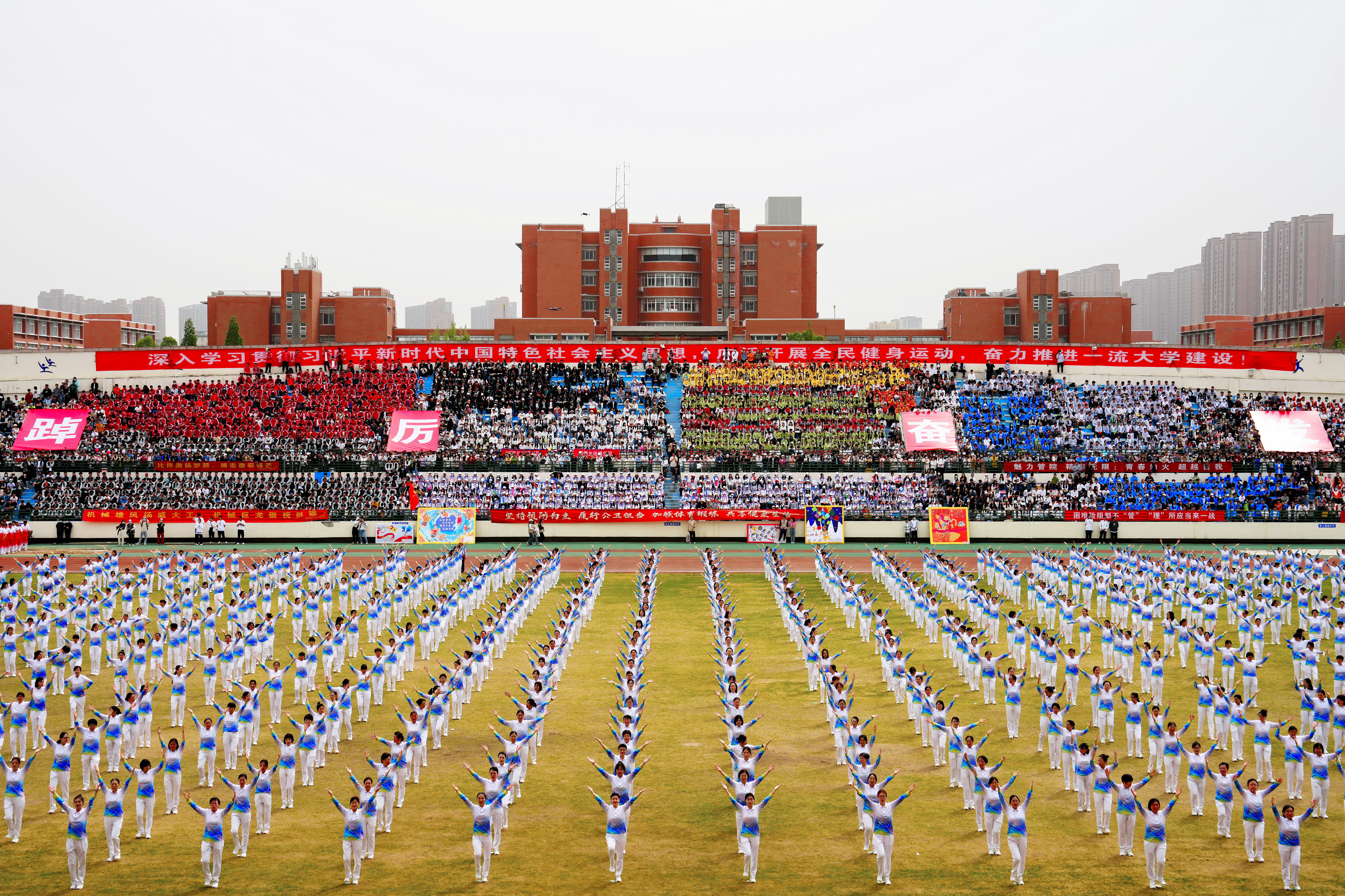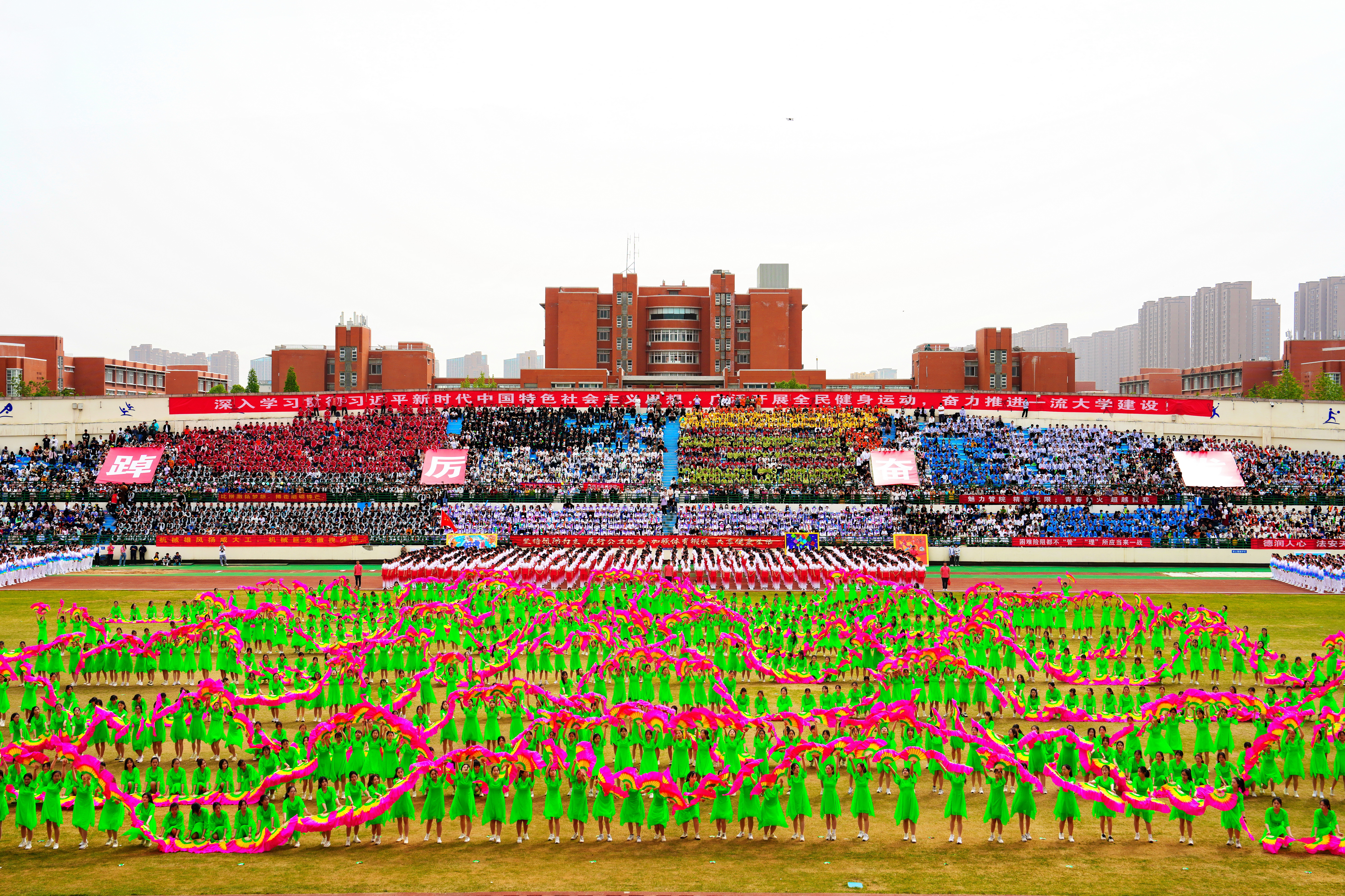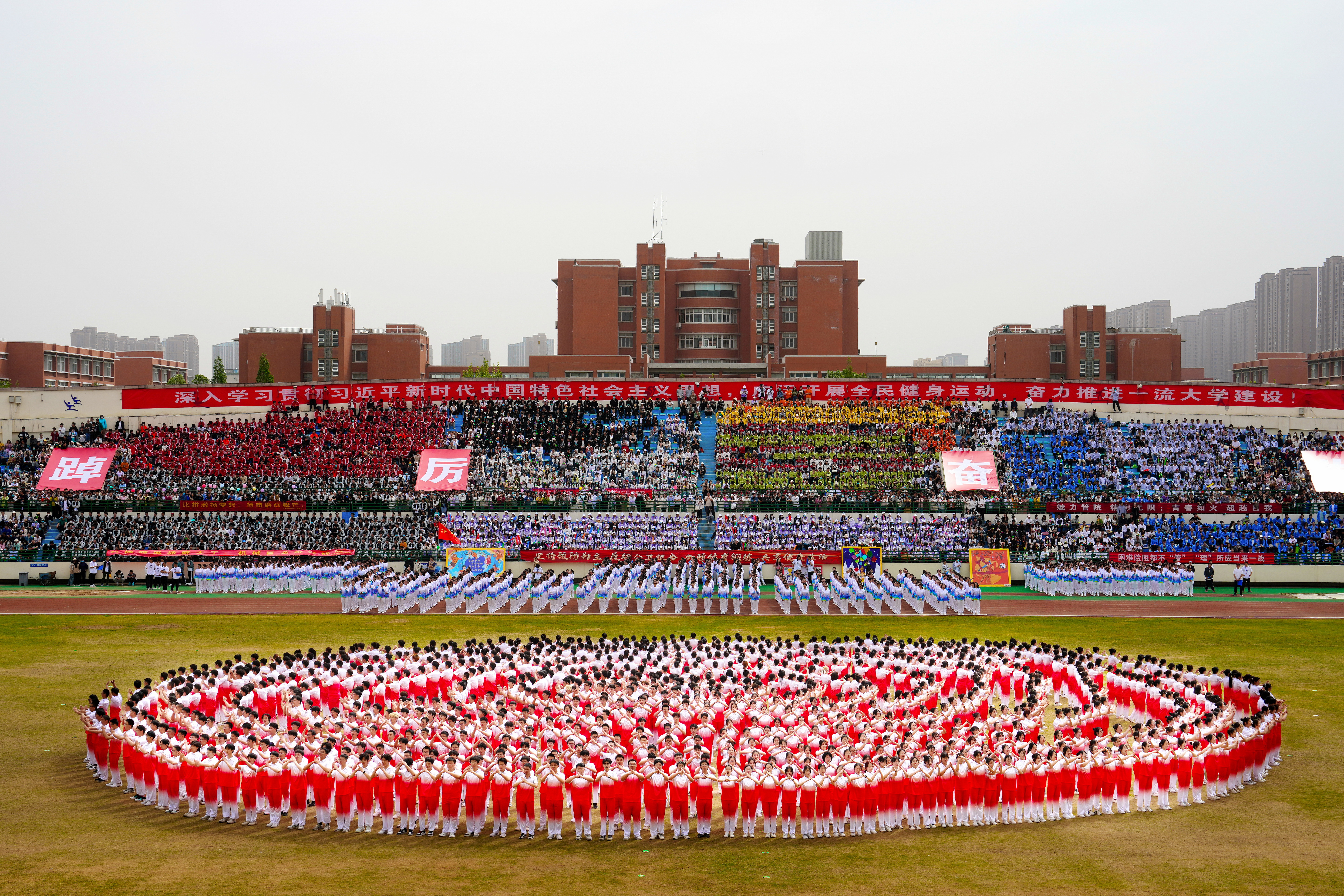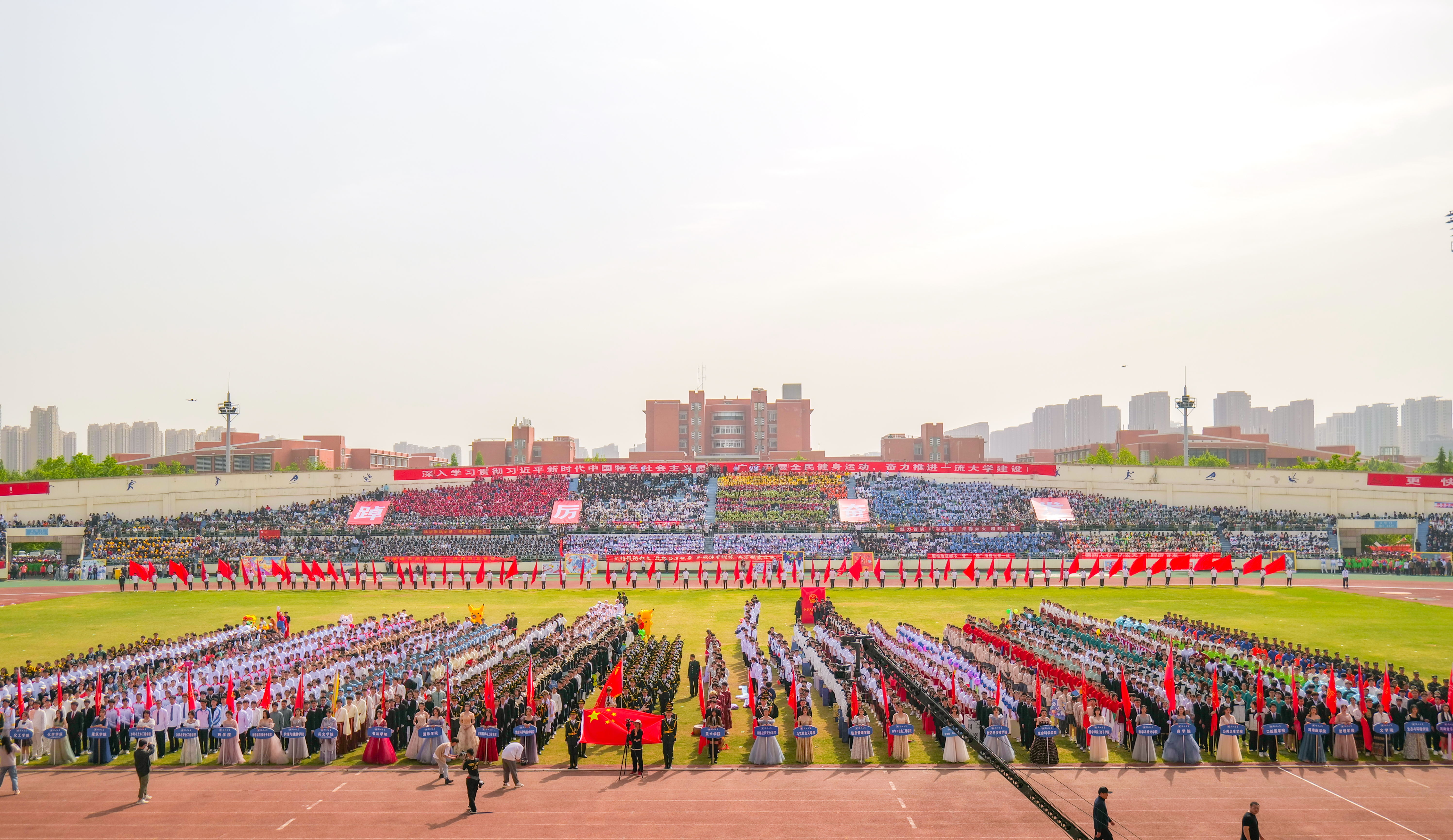 大型开幕式展演《同在阳光下》拉开帷幕,共分为四个篇章。第一篇章“漫舞长空”,河南省体育局航空模型队表演的S8D火箭助推遥控滑翔机、TOC双机编队特技飞行、F3N直升机花式飞行等节目引来现场观众阵阵欢呼;第二篇章“锦绣华章”,800名来自各院(系)的女生,伴着音乐婀娜舞动着手中飘逸的折扇,时而围拢成娇艳牡丹,时而化作连绵群山,时而呈现滚滚花浪,她们乘风破浪、踏浪而行,尽显朝气蓬勃、青春活力,表达了郑大学子对祖国繁荣昌盛的美好祝愿;第三篇章“中原武林风”,来自2022级的1000名本科生带来武术表演,他们精神饱满、刚柔并济、动作整齐划一,在拳与掌的交错之间,在气息与呐喊的转换之间,传递着中国力量和文化自信;第四篇章“八段之锦”,来自50多个基层单位的1000余名女领导、女教授、女劳模、女教职工,在一招一式、一呼一吸中,展示了ac米兰官网中文网站女教职工英姿风采以及团结奋进、踔厉奋发建设世界一流大学的坚定信心。最后,所有表演成员带领全场观众在《阳光总在风雨后》的歌声中一起舞动双手,现场鼓声、掌声、欢呼声此起彼伏,将开幕式推向高潮。
