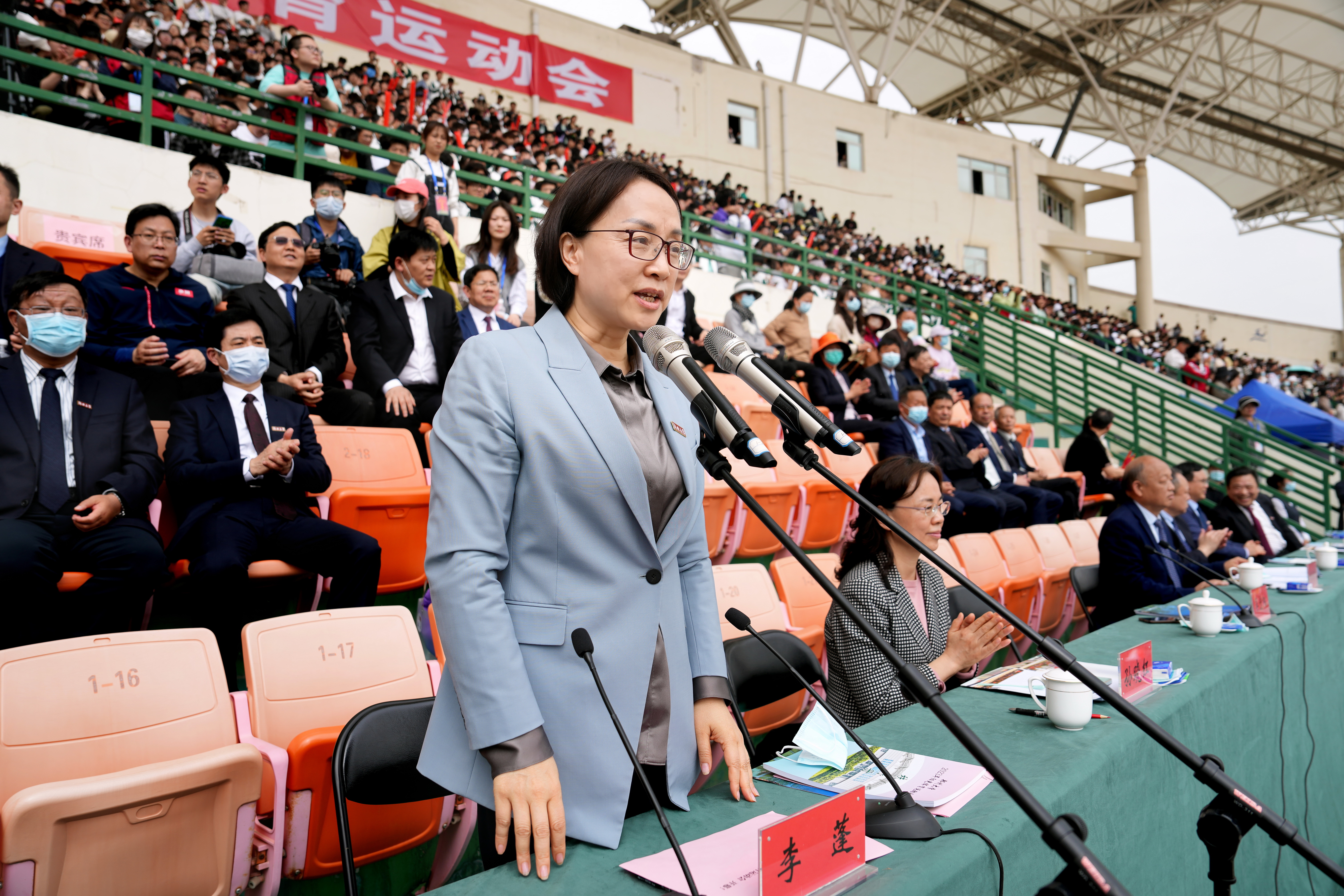 校长李蓬院士致开幕词。她表示,2023年阳光体育运动会是一场大家期待已久、万众瞩目的体育盛会,并代表学校向运动会的隆重召开表示祝贺,向参与筹备组织工作的师生员工表示感谢,向全体运动员和师生表示问候。她指出,学校深入贯彻落实习近平总书记关于体育与健康工作的重要指示精神,群众性体育活动蓬勃开展,竞技体育成绩显著,学校体育事业取得快速发展,多支运动队代表国家队征战国际赛场,展现中国风采,发出郑大声音,学校连续六次荣获“全国体育工作先进单位”称号,体育锻炼蔚然成风,体育文化深入人心,郑大人用实际行动诠释着“体育关乎你我,生命在于运动”。她强调,体育是一种魅力,也是一种力量,阳光体育运动会是学校的体育盛会,也是对学校体育工作成果的集中展示和全面检阅,她希望各代表队及全体运动员,弘扬体育道德风尚,遵规守纪、奋勇争先、赛出风格、赛出水平,取得竞赛成绩和精神文明双丰收;希望全体裁判员恪尽职守、公平公正、统一尺度、秉公执裁,全心全意为比赛护航;希望广大师生在体育锻炼和群体竞赛中强筋骨、增知识、调感情、强意志,不断增强体质,提高体育修养,把高昂斗志和进取精神凝聚到学校一流大学建设的宏伟征程中,在学校事业发展进程中展现新作为、做出新贡献。