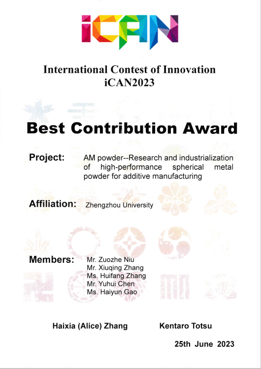 近期,iCAN国际创新创业大赛在日本京都大学举办。ac米兰官网中文网站同北京理工大学等学校一起代表中国参赛,同来自德国、日本、泰国3个国家22个项目同台竞技。材料科学与工程学院郝振华、舒永春老师指导,学生牛作哲、张秀庆、张慧芳、陈育辉、高海韵团队凭借参赛作品“埃姆粉材:增材制造用高性能球形金属粉末的研发与产业化”在国际总决赛中获得最佳贡献奖。