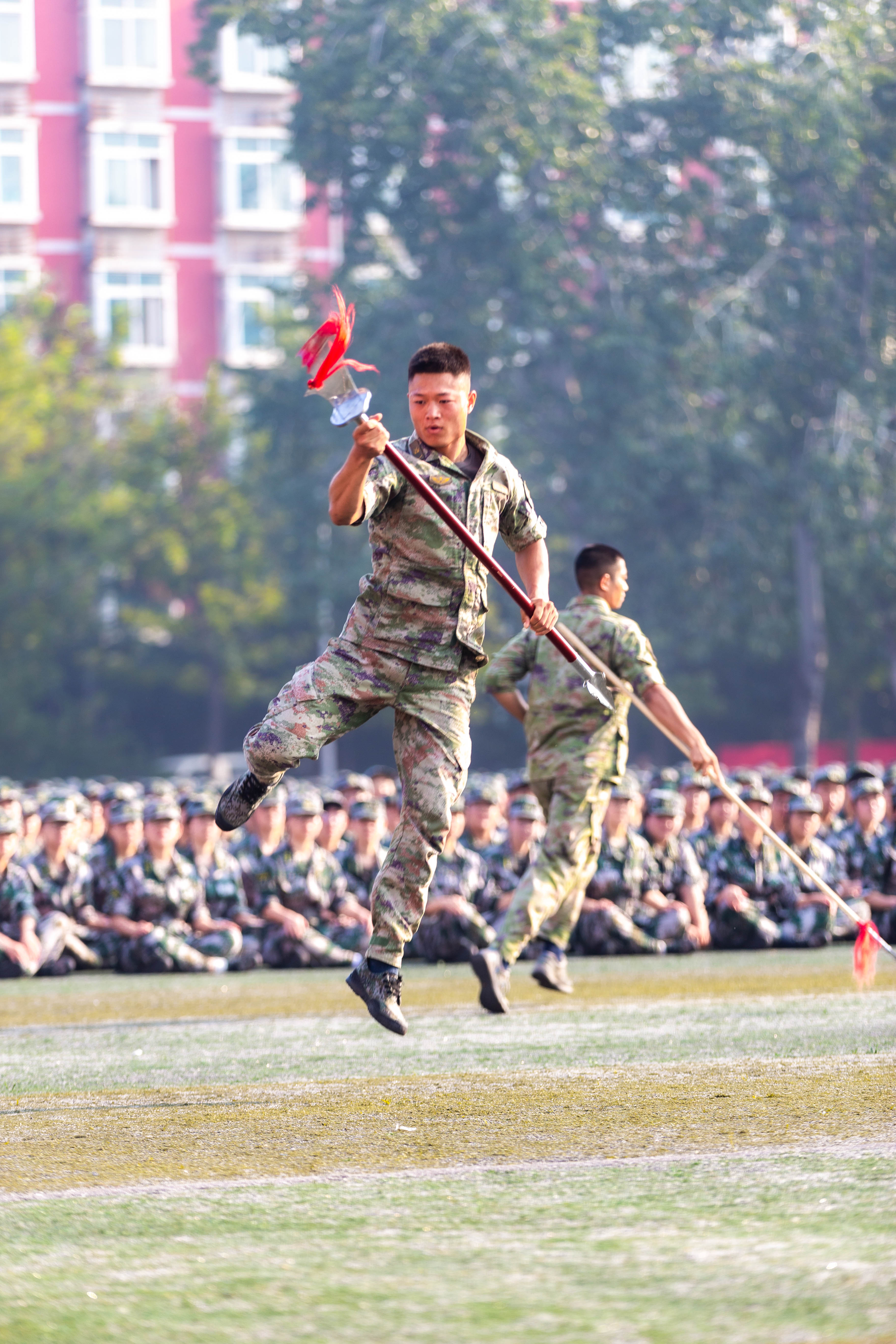 动员会上,杨根思部队教官进行了武术、格斗、刺杀操表演,洪亮的口号、利落的招式,尽展当代军人的卓越风姿,赢得了全场师生的阵阵掌声。同学们个个精神抖擞,斗志昂扬,彰显了郑大学子朝气蓬勃、爱国尚武、勇往直前的精神风貌。