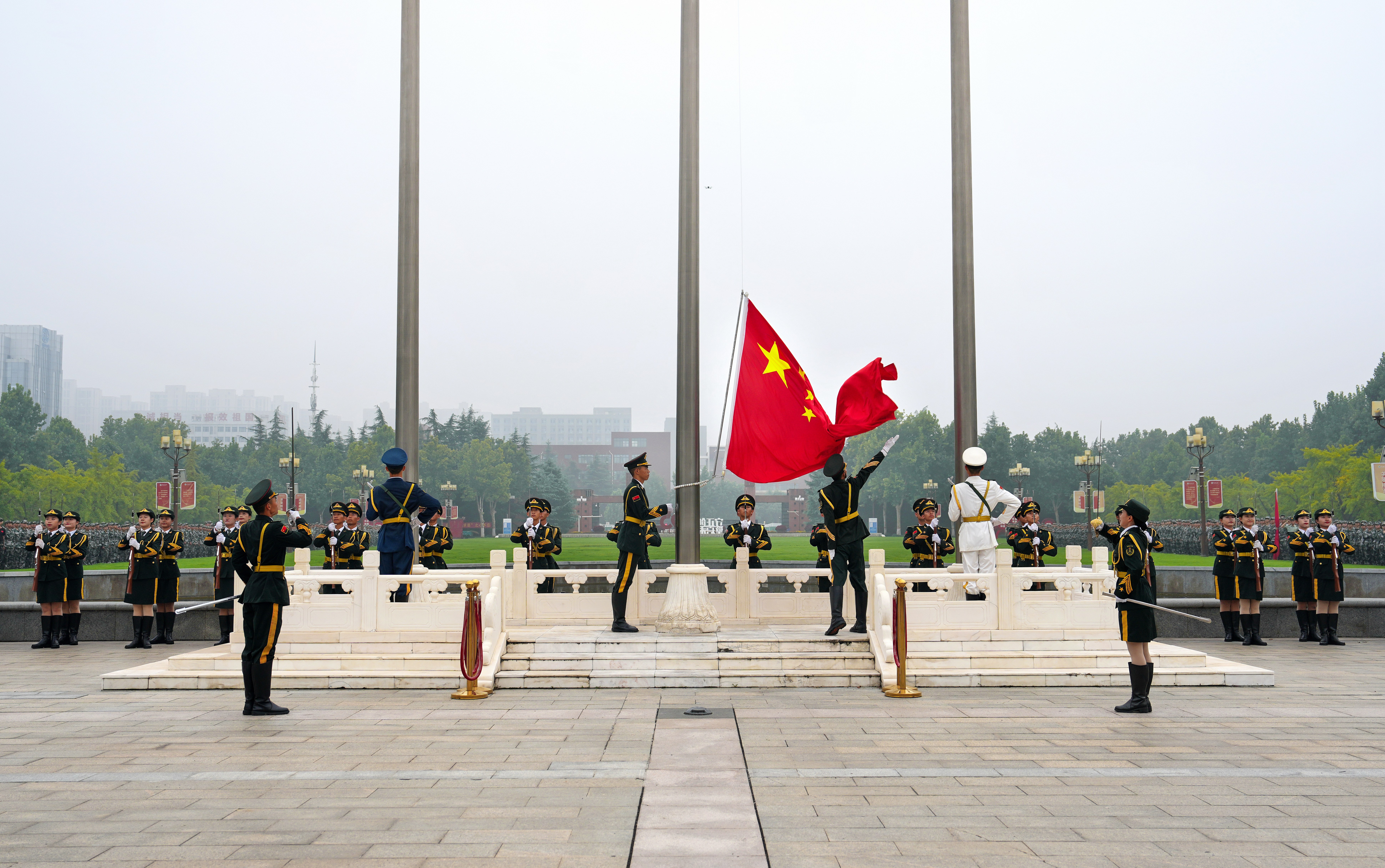 清晨,主校区五星广场上的师生们早早集合完毕,昂首正姿,庄严肃穆。6点50分,随着指挥员嘹亮的口号,升国旗仪式正式开始。国旗护卫队队员身着礼宾服,手执礼宾枪,身姿挺拔俊逸,步伐铿锵有力,护送国旗入场。伴随着雄壮的《义勇军进行曲》,旗手振臂一挥,鲜艳的五星红旗冉冉升起,在晨曦中迎风飘扬,全场师生齐唱国歌,行注目礼,爱国之情和强国之志在心中激荡。