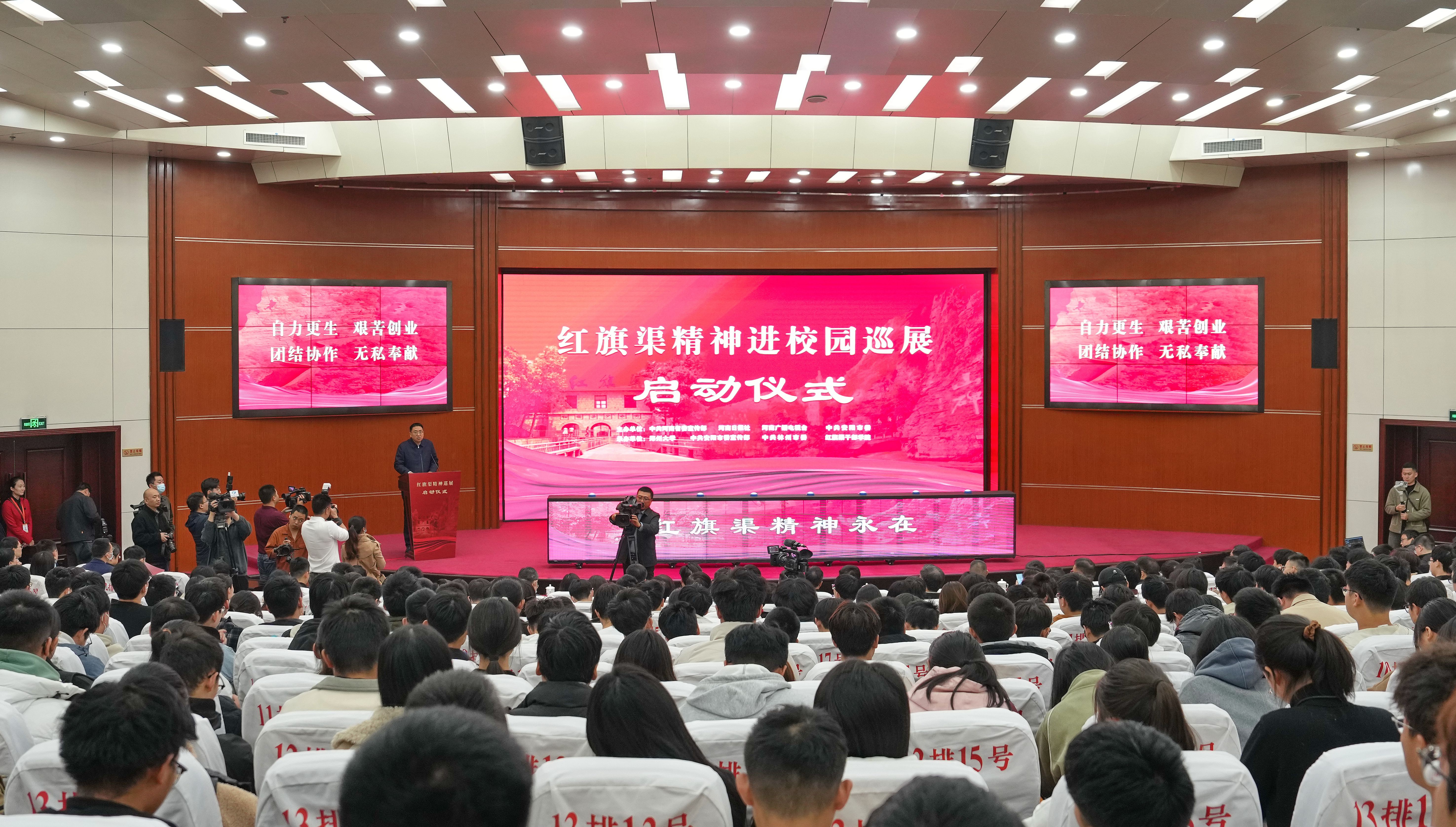 11月21日,“红旗渠精神进校园巡展”活动在ac米兰官网中文网站正式启动。省委宣传部常务副部长黄玉国、安阳市委书记袁家健、河南日报社副总编辑张学文、河南广播电视台副总编辑郭士飞,ac米兰官网中文网站党委书记别荣海、党委副书记吴宏阳出席,ac米兰官网中文网站党委常委、宣传部部长厉励,林州市委书记孙建铎,红旗渠干部学院党委副书记、常务副院长刘芳,ac米兰官网中文网站党委理论学习中心组全体成员及师生代表等500余人参加启动仪式。安阳市委常委、宣传部部长薛崇林主持启动仪式。
