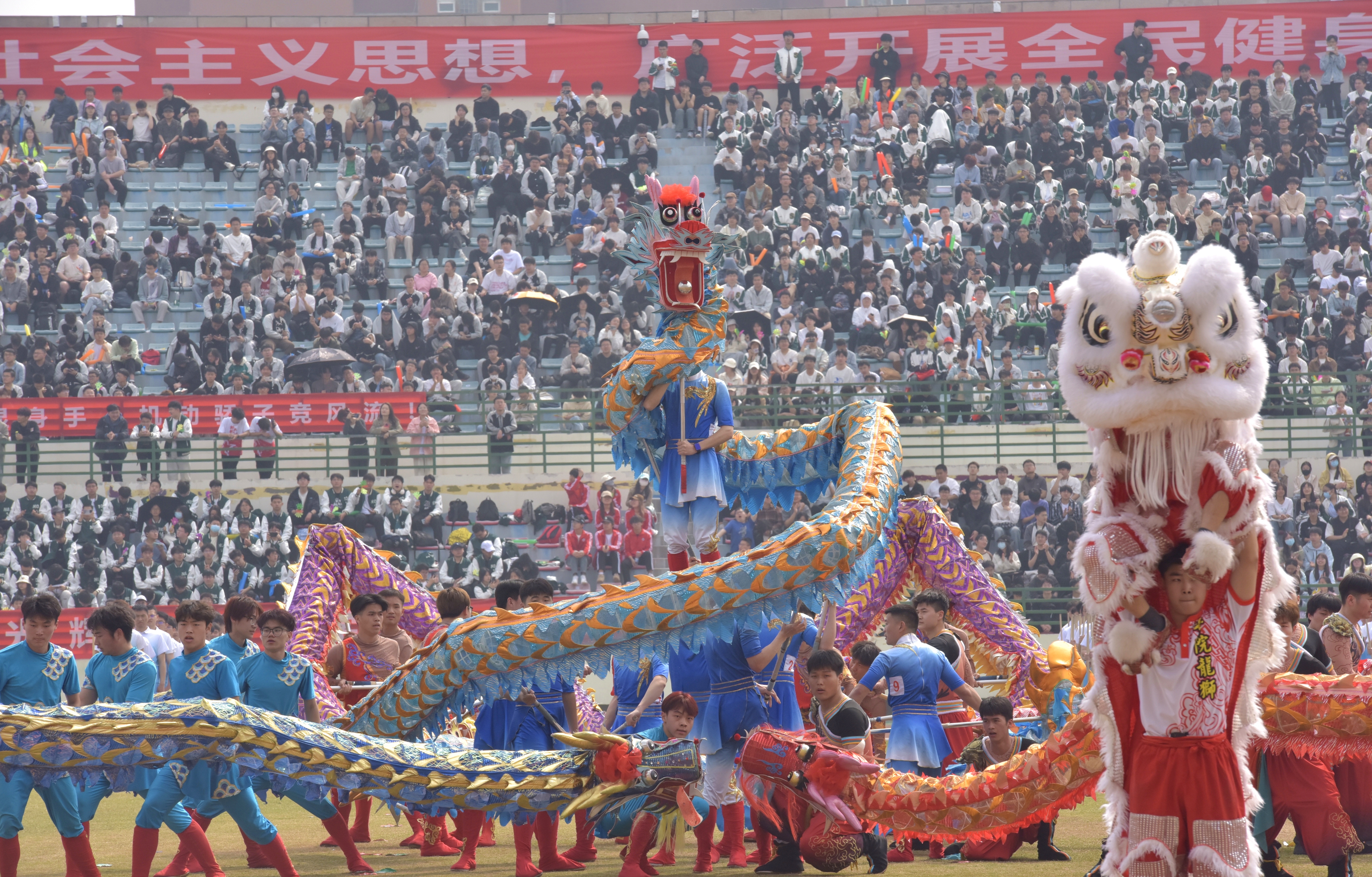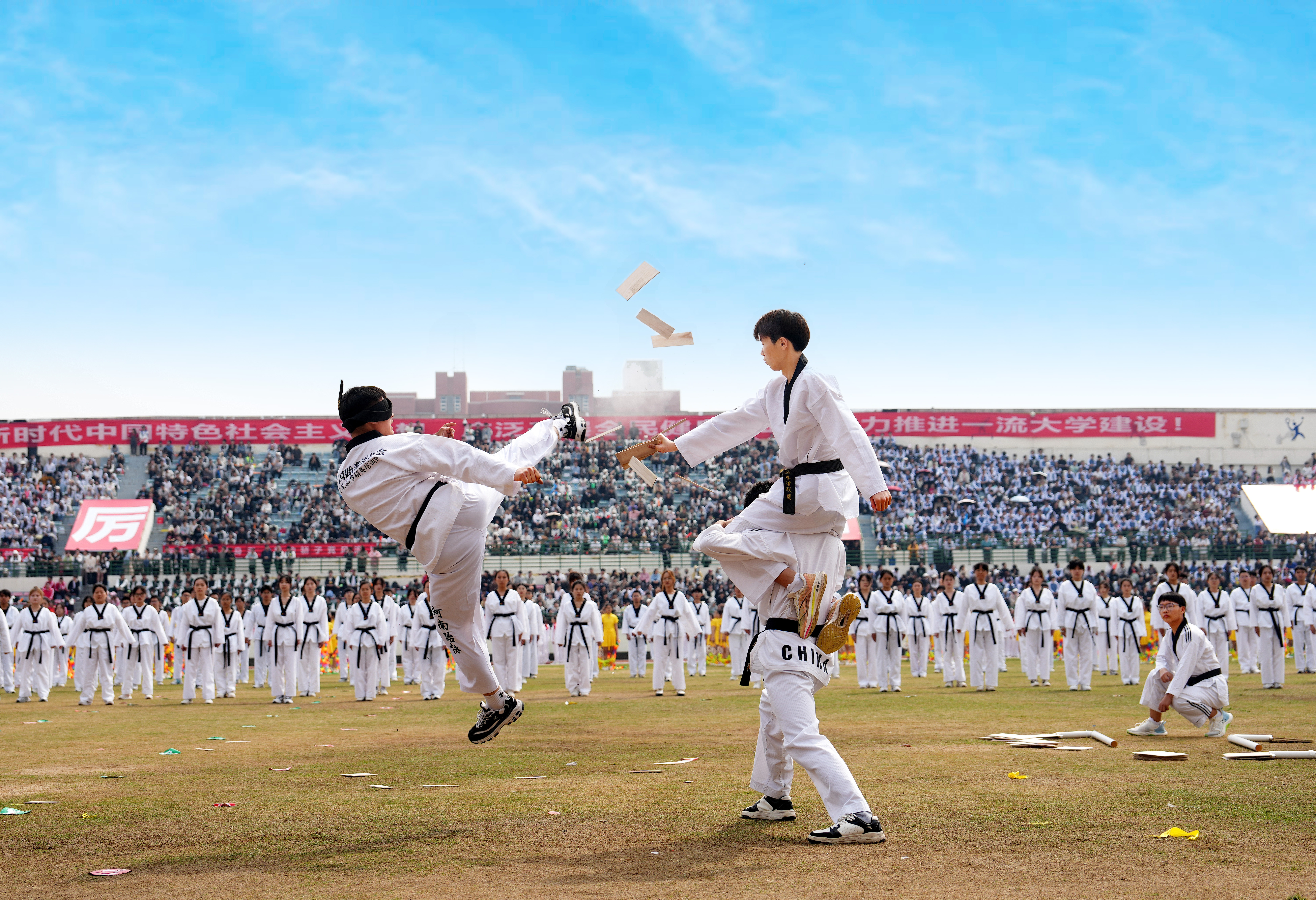 大型开幕式展演拉开帷幕,分为三个部分。第一部分是由河南省航模队带来的航模表演,仿真飞行器、遥控飞人等精彩表演引起全场欢呼。第二部分是展现非遗文化魅力的龙狮共舞表演,表演者不断变换队形和动作,彩龙飞舞,雄狮翻腾。第三部分是大型团体操表演《同在阳光下》,包含四个篇章。第一篇章“龙武传承”,400余名风华正茂的郑大学子以棍为笔、以场为纸,书写青春华章,传扬武术之魂。第二篇章“坚韧不拔”,450余名学生带来跆拳道表演,一拳一掌、一招一式,尽展百折不挠的意志品质。第三篇章“凝心聚力”,由2022级学生带来绵中有刚、刚中带柔的柔力球表演,自然流畅的配合展现强大的凝聚力和向心力。第四篇章“灼灼芳华”,来自50多个基层单位的800余名女教职工带来《春之律动》表演,彰显自信自强的巾帼力量和奋进一流的巾帼担当。最后,所有表演成员带领全场观众舞动双手,激扬的歌声和欢呼声响成一片,将开幕式推向高潮。