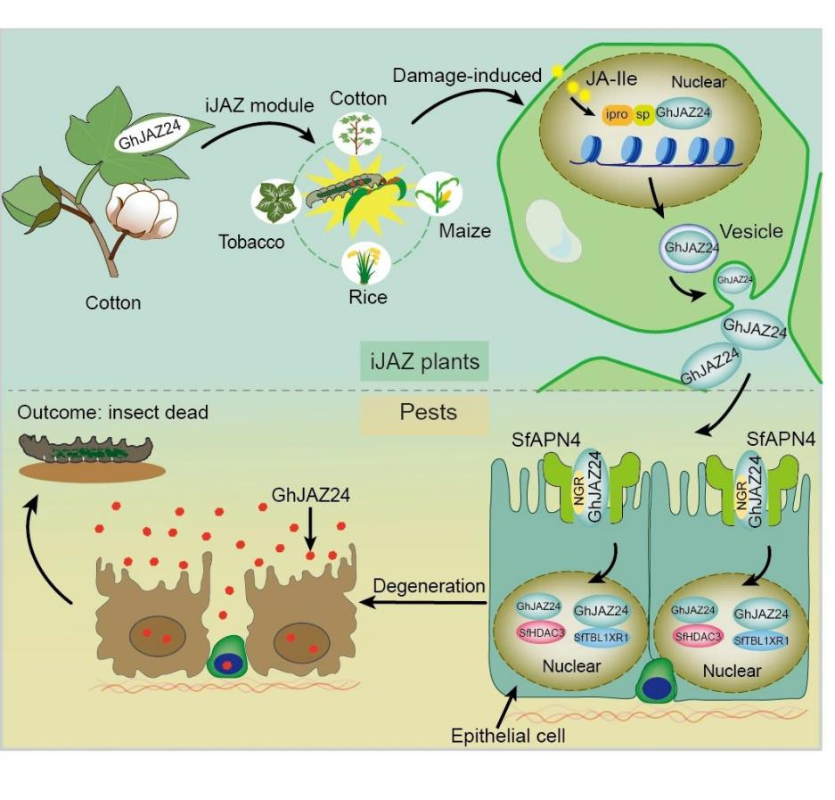 草地贪夜蛾、棉铃虫、玉米螟、稻纵卷叶螟等鳞翅目害虫会对玉米、棉花、水稻、蔬菜等农作物造成重大破坏,部分害虫对目前广泛应用的苏云金芽孢杆菌Bt蛋白及一些化学农药产生了抗性,亟需新型杀虫蛋白来进行防控。针对上述难题,李付广研究员团队经过多年的研究发现了棉花源新型杀虫蛋白GhJAZ24。GhJAZ24蛋白的杀虫机制与苏云金芽孢杆菌Bt蛋白的杀虫机制完全不同,可在生产上替代过表达Bt蛋白的抗虫农作物,未来可在林草、果蔬等植物的鳞翅目害虫防控方面发挥重要作用。同时,可通过GhJAZ24蛋白进一步研制高效稳定的杀虫多肽,杀虫多肽作为绿色生物农药,在防控草地贪夜蛾、棉铃虫、玉米螟、稻纵卷叶螟等鳞翅目害虫方面发挥重要作用。