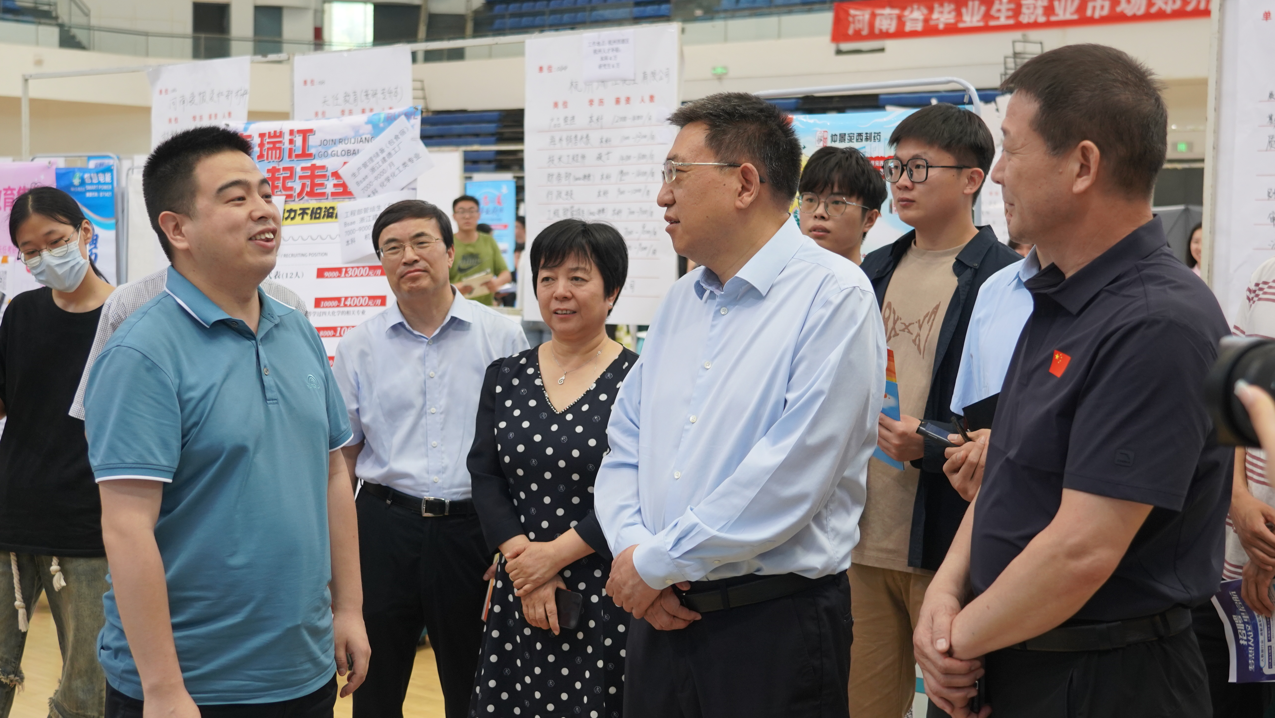 在双选会现场,别荣海与郑州宇通集团有限公司、河南张仲景大药房股份有限公司等企业沟通交流,深入了解企业用人需求和毕业生求职情况,对用人单位大力支持学校毕业生就业工作表示感谢。他与正在投递简历的毕业生亲切交谈,鼓励毕业生把握校招机会,争取早日就业。在“乐业小站”、就业咨询室、政策宣讲区,别荣海与工作人员亲切交谈,详细了解“五险一金”“郑州市人才公寓”等相关政策以及学校各类就业业务办理情况,对打通就业服务“最后一公里”表示充分肯定。