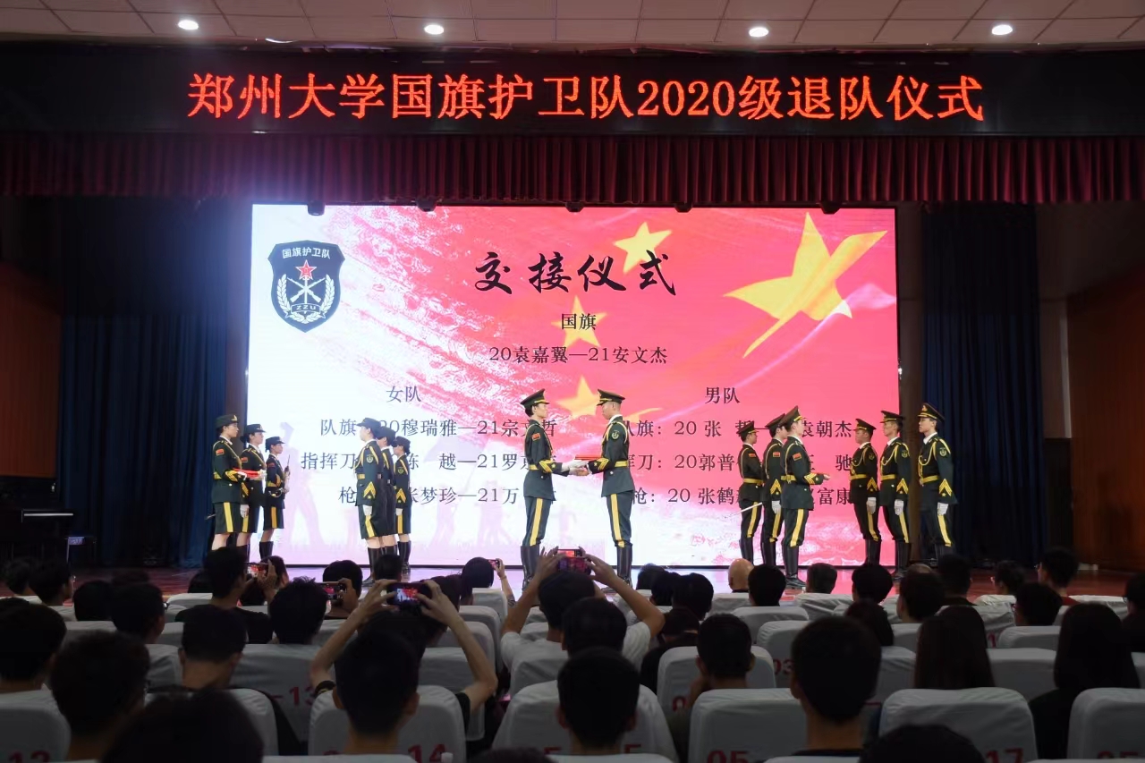 ac米兰官网中文网站国旗护卫队是学校精神文明建设的重要窗口,是学校爱国主义教育的一面旗帜,是学校国防思政一体化工作品牌创建的重要平台。自2004年组建,发展至今已有20年的历史,是全国高校具有较大影响力的国旗护卫队。20年的传承与坚守,承载着岁月的积淀,铭记着永恒的执着,镌刻着不懈的追求。一批批队员用赤诚守护着五星红旗,用行动凝聚着郑大学子的爱国情怀,这支队伍已锻造成为一支召之即来、来之能战、战之必胜的“硬核”队伍。进入新的发展阶段,队伍将继续砥砺前行,深化国防思政育人实效,把队伍建设融入到助力打好学科建设攻坚战的实践中,为开创一流大学建设新局面作出更大贡献。