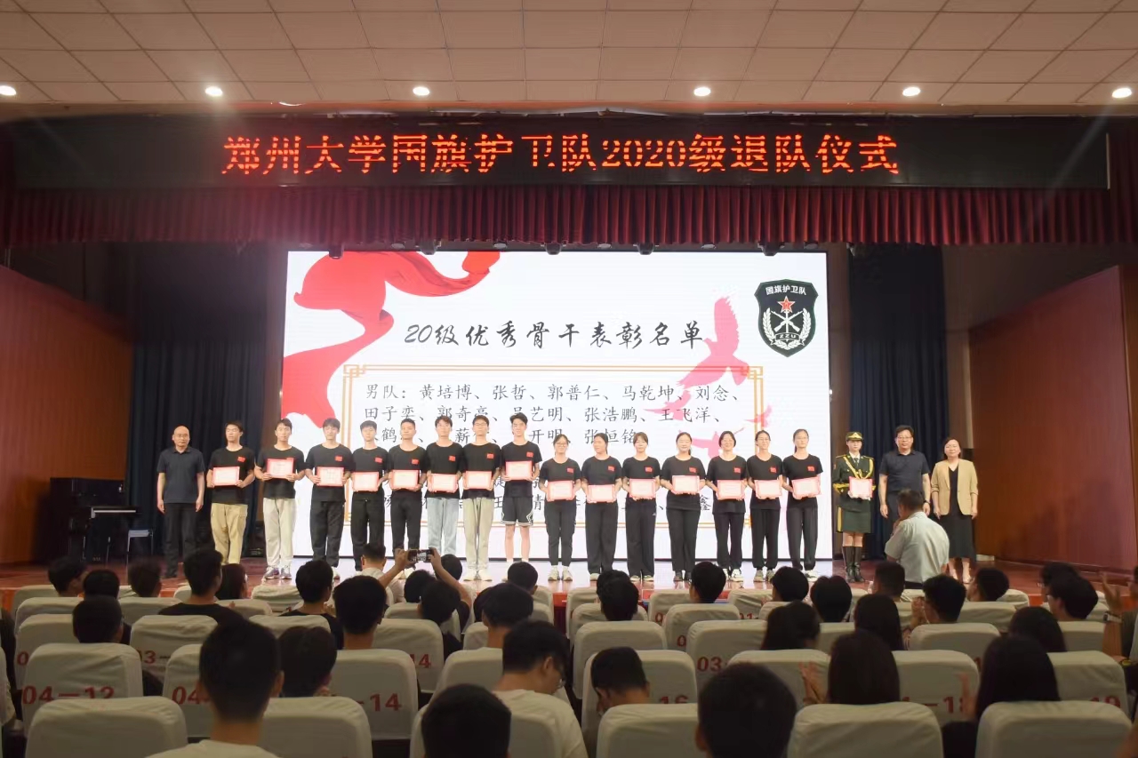 王利国在讲话中充分肯定了国旗护卫队取得的优异成绩,并向2020级队员圆满完成学业和护旗任务,迈向人生新征程表示祝贺。他指出,国旗护卫队寒来暑往,勤学苦练,是校园里的一道风景线;队员们具有过硬的集体意识和作风意识,在防疫物资配送、抗洪抢险等任务中,展现了坚韧不拔的毅力和冲锋陷阵的尖兵精神,彰显了新时代郑大人的风貌和担当。他希望队员们,要心怀“国之大者”,厚植家国情怀,做“请党放心,强国有我”的青春追梦人;要牢记“持之以恒”,淬炼过硬本领,坚持退队不退志、退队不退步;要不忘“心之所向”,磨砺坚毅品格,继续发扬国旗护卫队精神,在强国建设、民族复兴的伟大征程中谱写壮丽的青春华章。