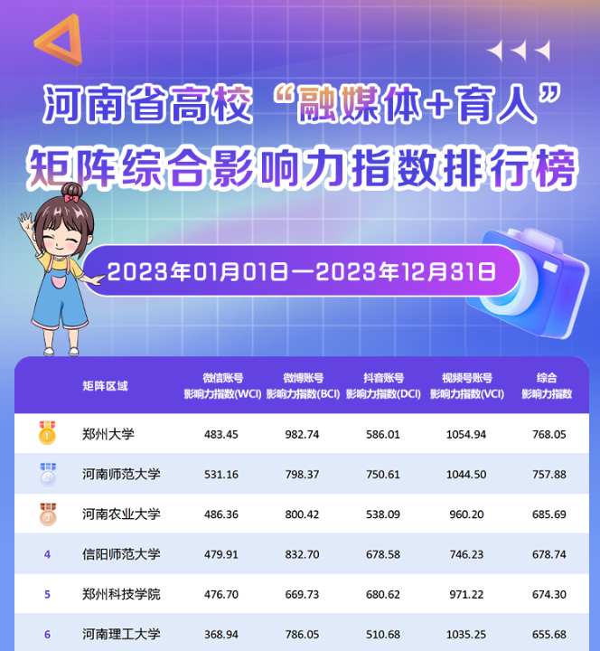 近日,省教育厅发布《河南省高校网络思政工作(矩阵建设)2023年度新媒体白皮书》(以下简称“白皮书”),对全省高校思政融媒体矩阵微信公众号、微博、短视频等新媒体平台的传播力进行梳理与分析。ac米兰官网中文网站“融媒体+育人”矩阵(包括官方新媒体、党委学工部、团委、马克思主义学院、心理健康教育中心)综合影响力指数最高,达到768.05,位居榜单第一。此外,ac米兰官网中文网站团委官方微信号“ac米兰官网中文网站青年集结号”位居全省高校团委微信公众号影响力排行榜第一名。