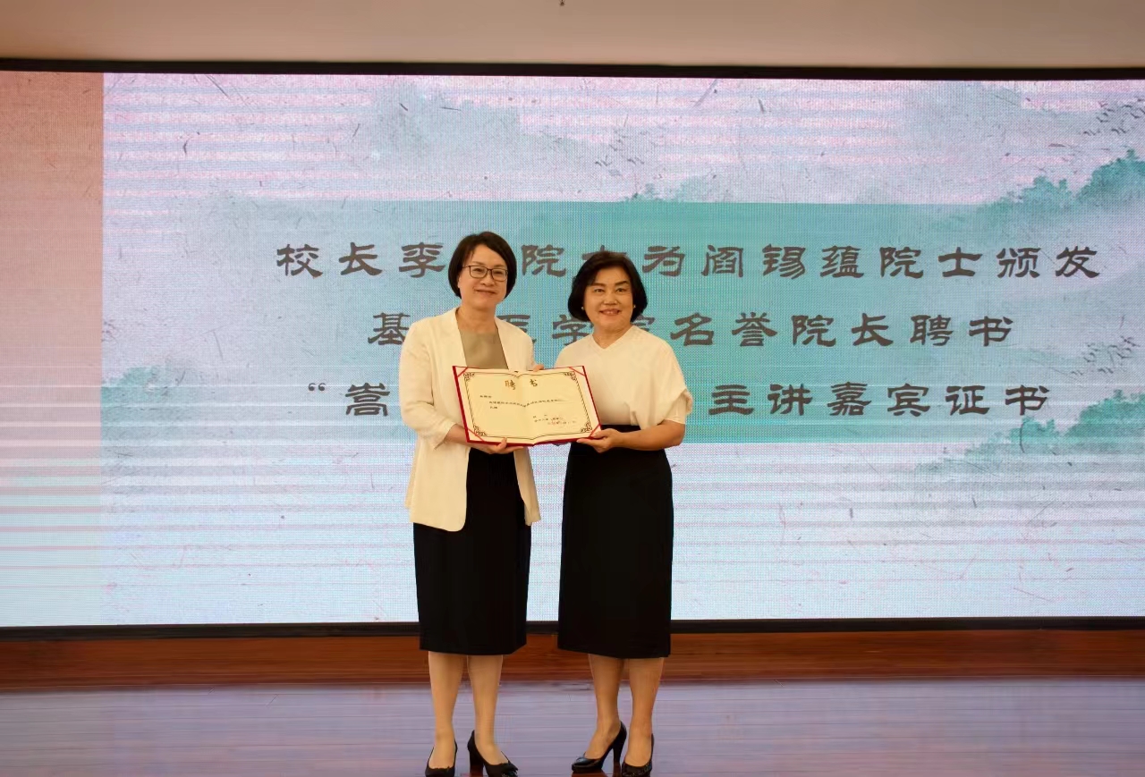 聘任仪式上,李蓬为我校1977级杰出校友、中国科学院院士、发展中国家科学院院士阎锡蕴颁发“嵩阳大讲堂”主讲嘉宾证书。
